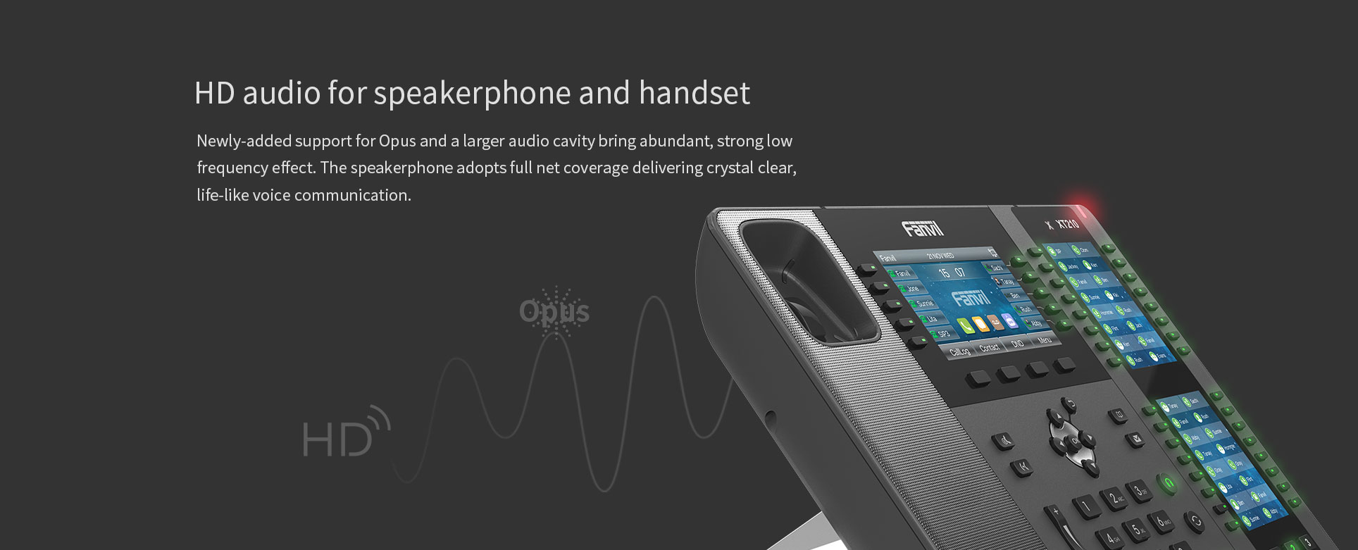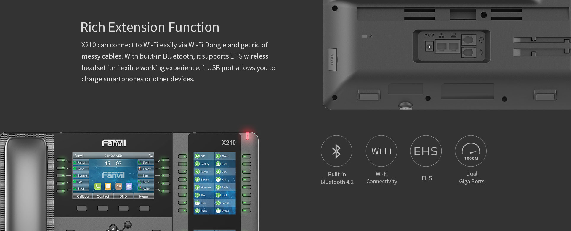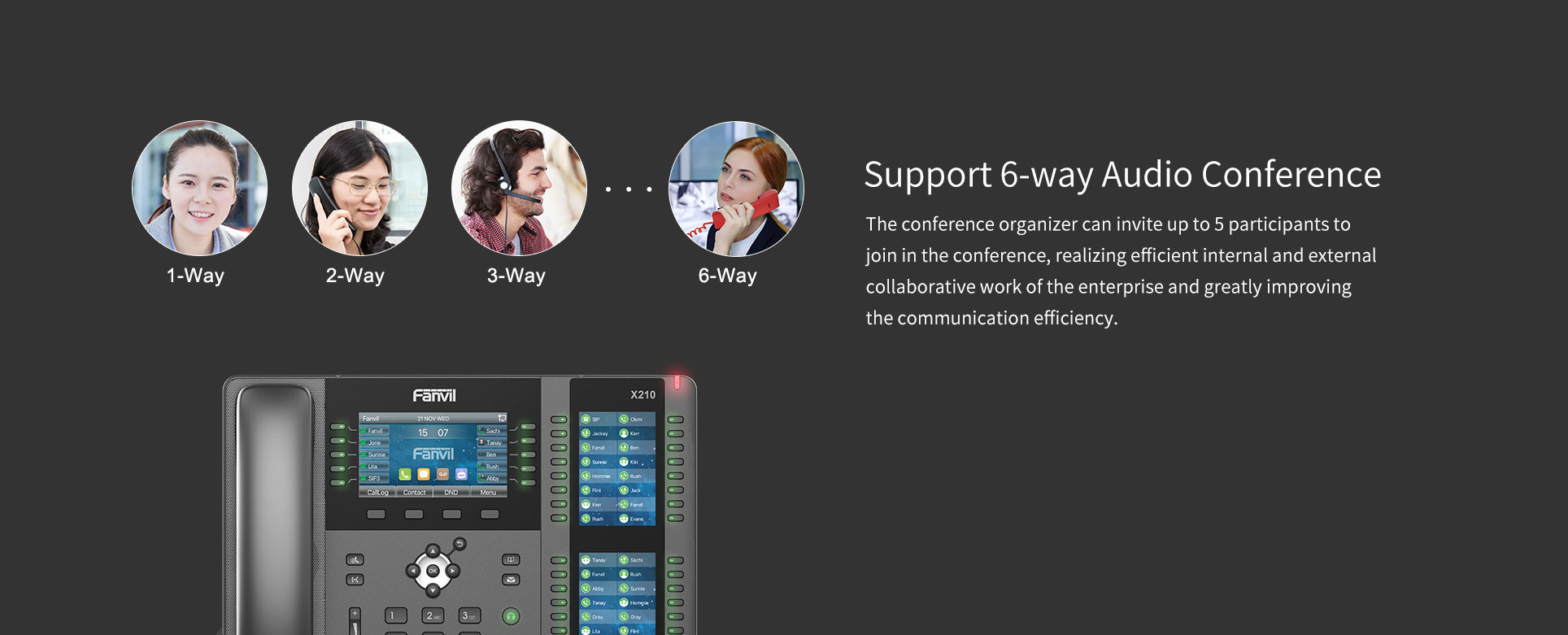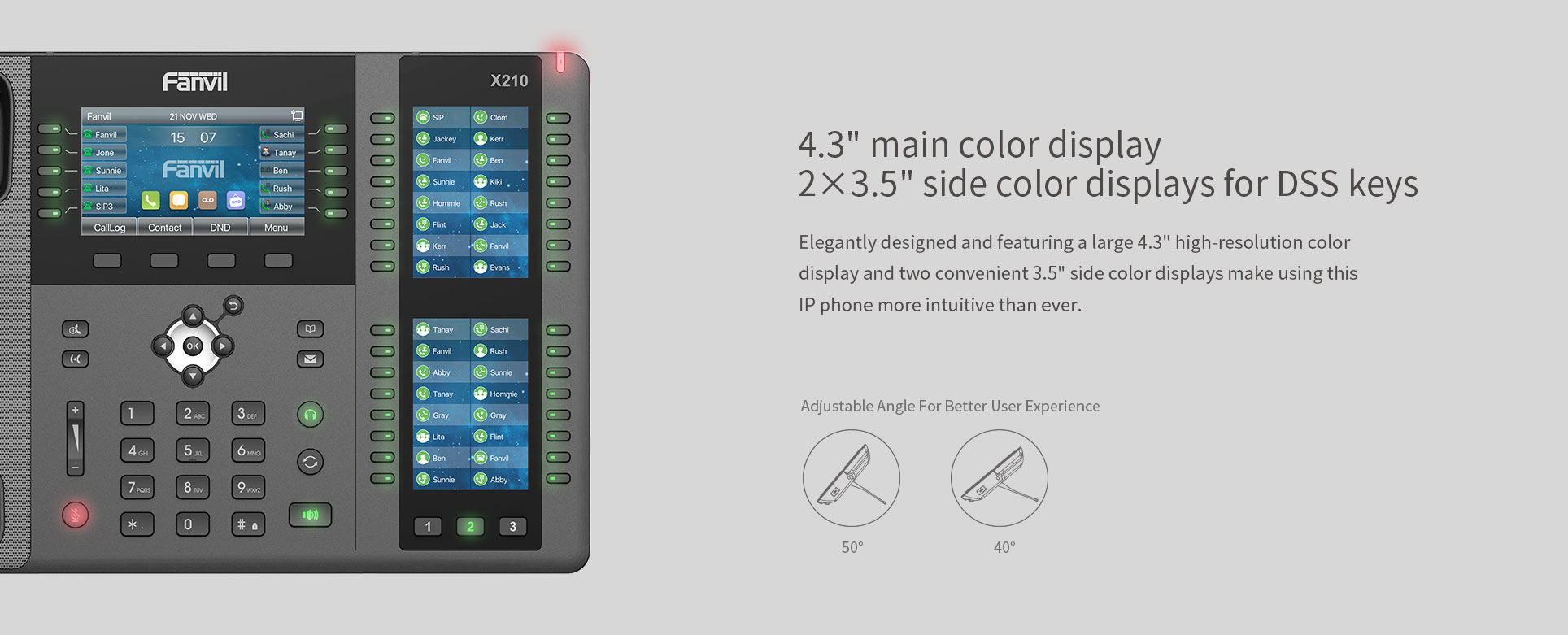 X210 is a high-end enterprise IP phone for users who need to get access to flexible and advanced features to handle medium to high call volumes in their daily work. Featuring 10 DSS keys on 4.3" main color display, up to 96 DSS keys (32 physical) on 2×3.5" side color displays, X210 has up to 106 DSS keys in total to set for BLF, speed dial, group broadcasting function etc. It also comes with HD audio, built-in Bluetooth, Wi-Fi connectivity, EHS support, dual Gigabit, PoE, IP camera/SIP door phone integration, delivering vast productivity with these advanced features.