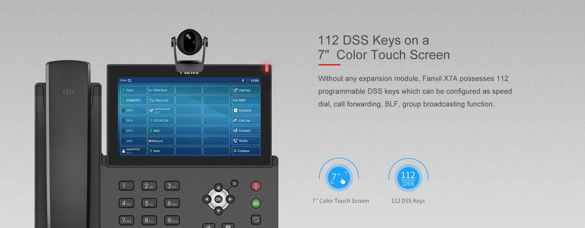 As a high-end enterprise IP phone with Android 9.0 OS, Fanvil X7A provides a more intelligent and smoother touch operation experience for the users. 112 DSS keys on the 7-inch color touch screen, built-in Wi-Fi, built-in Bluetooth make daily communication smarter and simpler. Matching an optional USB camera Fanvil CM60, Fanvil X7A can deliver a superb audio and video for the group conference.