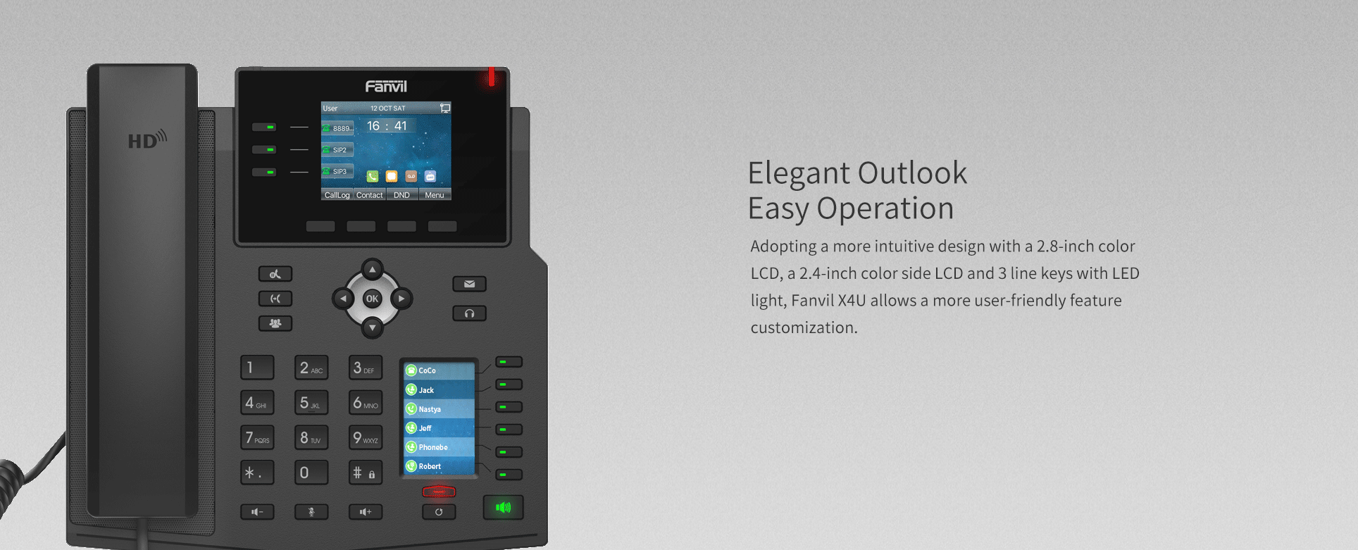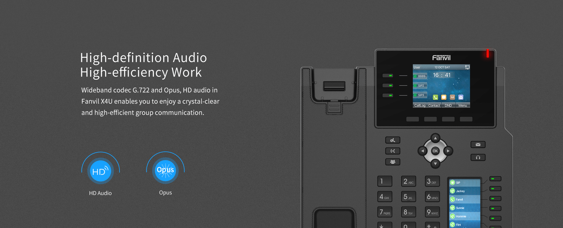 Fanvil X4U provides the direct access to instructions with two high-resolution 320x240 color displays, which is an ideal option for enterprises to improve the flexibility and have a greater productivity on daily work. Wideband codec of G.722 and Opus in this device delivers you an immersive HD audio experience in both high band and low band with the network.