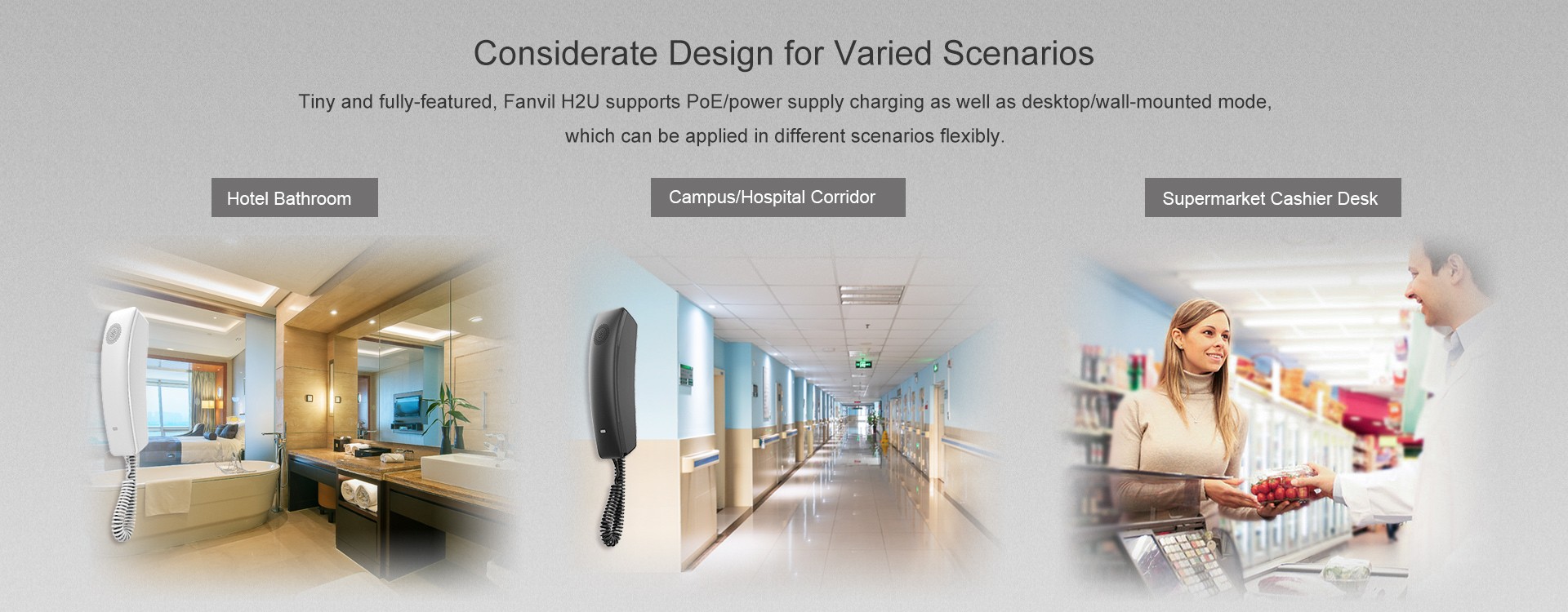 Tiny and stylish, Fanvil H2U compact IP phone possesses brand new features including 2 SIP lines, 10 speed dial keys, 1 programmable DSS key and a HD speaker on handset. Supporting desktop and wall-mounted mode, PoE and power supply charging mode, Fanvil H2U is more than a hotel phone and also can be applied in multiple scenarios, such as school, hospital, supermarket and residence.