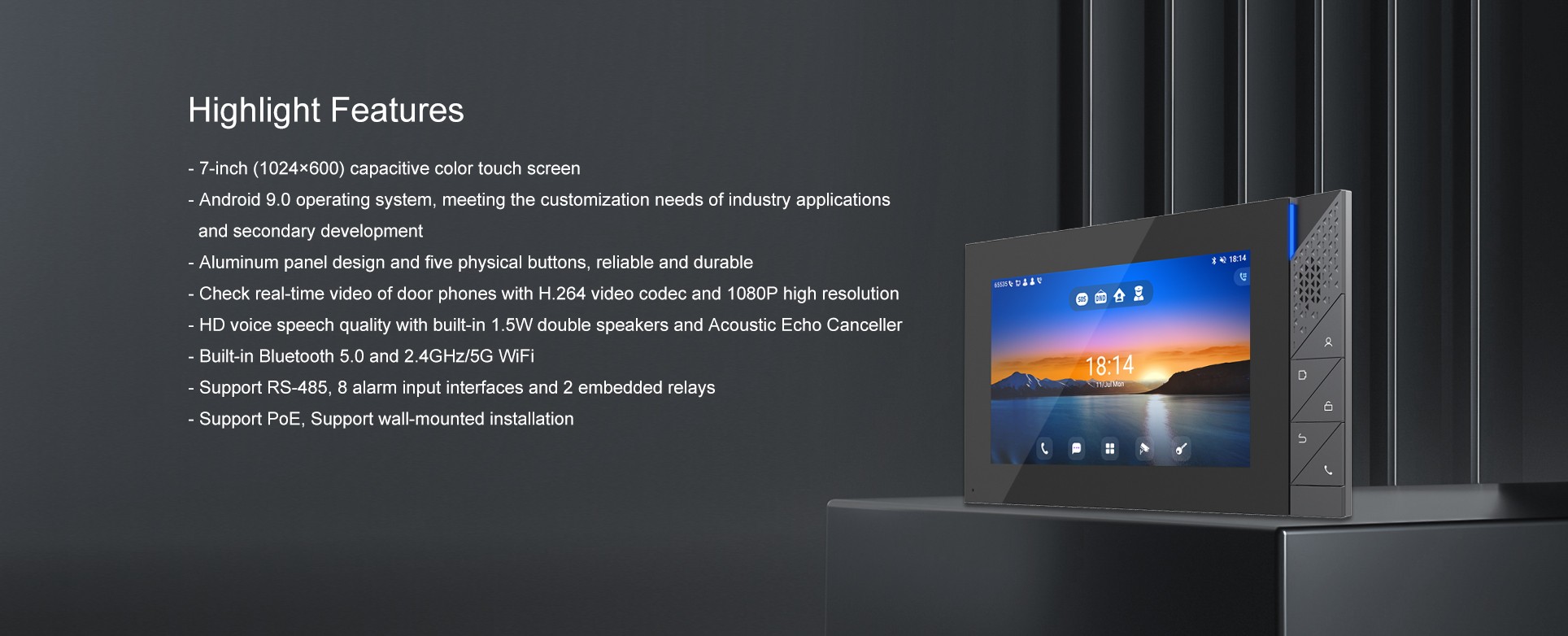 Fanvil i55A indoor station features 7-inch color touch screen with an intuitive UI. Based on Android 9.0 operating system, it meets industry application customization needs and secondary development. Featuring powerful functionalities like remote door opening and real-time monitoring for security devices, i55A serves as a management assistant for communities, villas and office buildings.