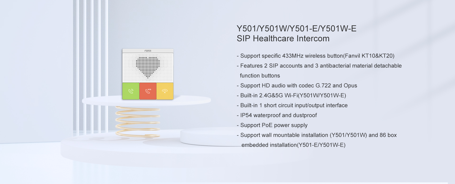 Fanvil Y501 series SIP healthcare intercoms are specially designed for home-based care, nursing house and other indoor application, realizing the emergency communication, security protection, broadcasting, etc. They feature HD audio, 2 SIP accounts, detachable DSS keys, IP54 waterproof and dustproof, and built-in 2.4G & 5G Wi-Fi(Y501W/Y501W-E). Y501 series provide different installation modes of standard 86 box embedded and wall mountable, bringing you a timely healthcare communication experience.