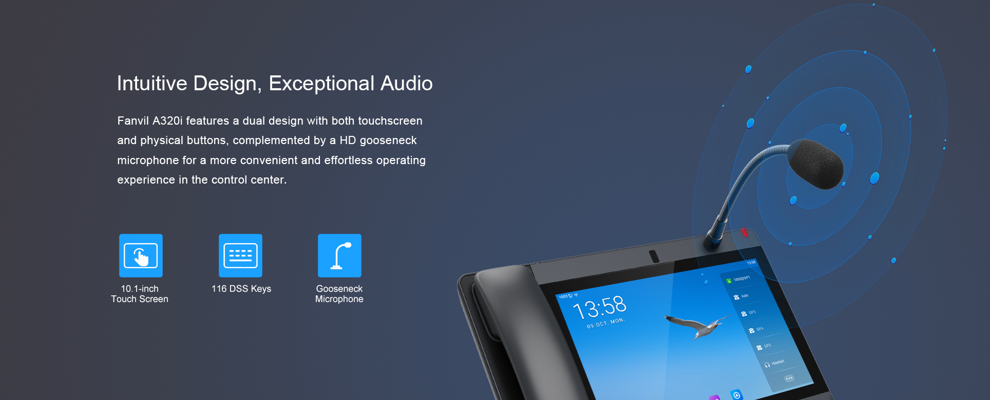 A320i is tailored for industry use, featuring a gooseneck microphone and HD hands-free calling. With 116 DSS keys, a 10.1-inch touch screen, Wi-Fi, and Bluetooth, it streamlines daily communication. Equipped with an adjustable camera and an HD PTM handset, it enhances audio and video experiences for group conferences. Compatible with SIP, it's perfect for management or command centers, offering functions like video calls, intercom, monitoring, and broadcasting.