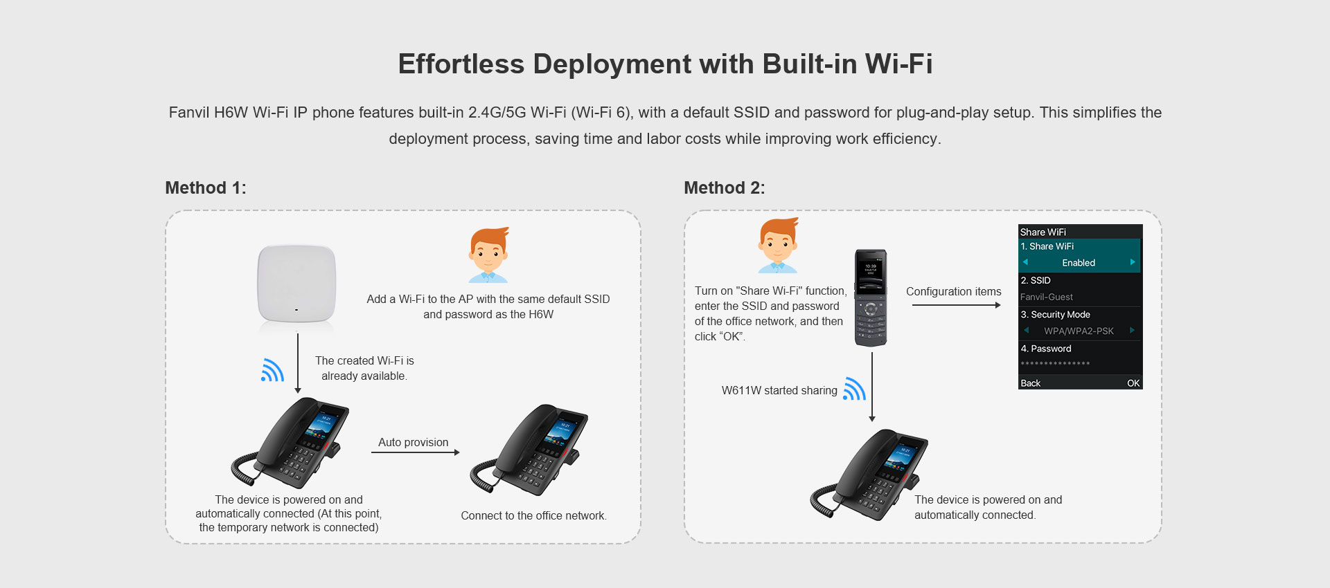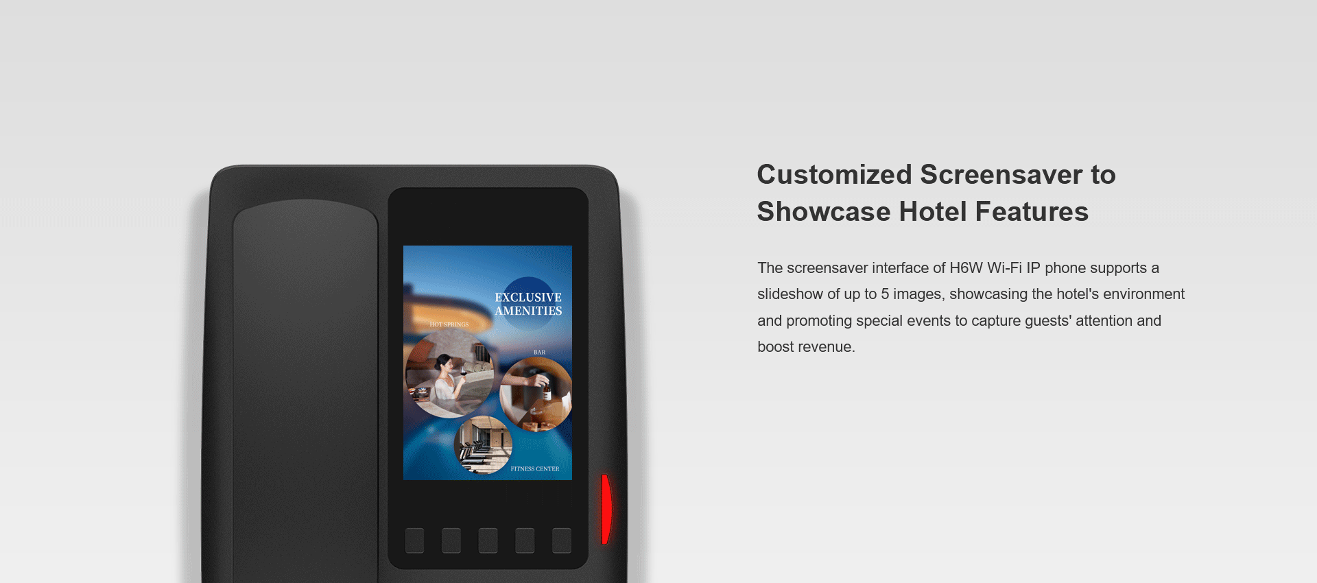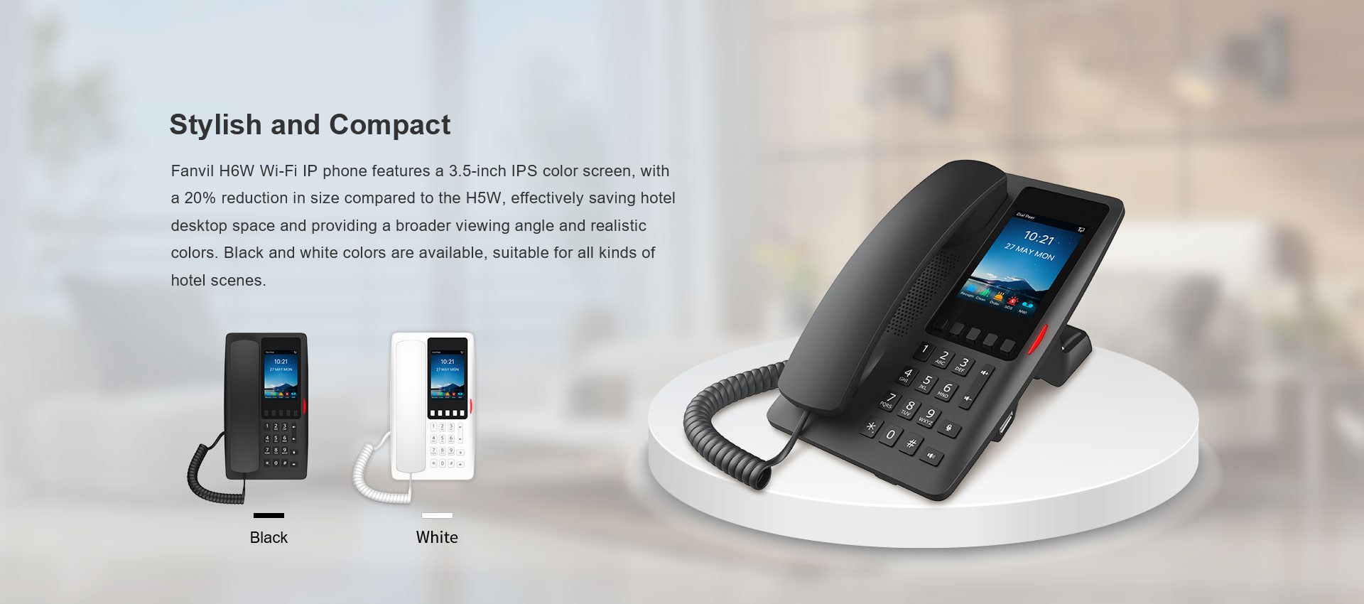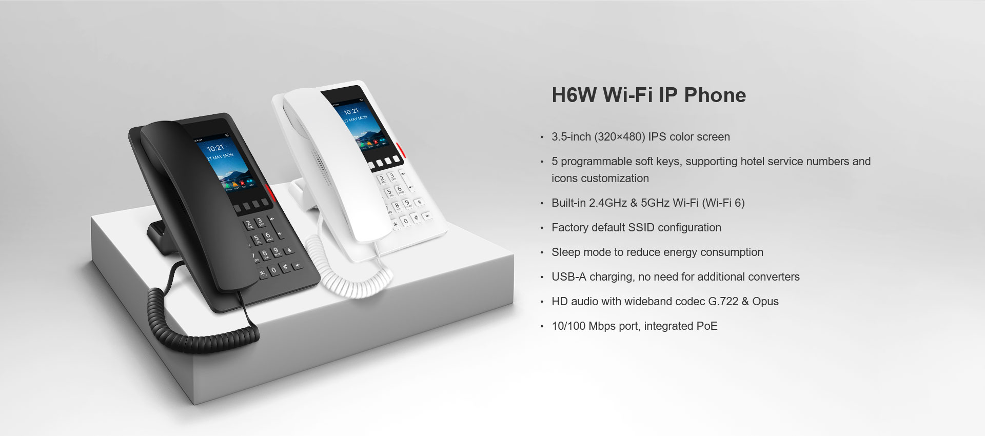 Fanvil H6W is a cost-effective Wi-Fi IP phone with multiple functions and an elegant appearance. It is equipped with 5 programmable soft keys for the services hotline, catering to diverse hotel scenarios. H6W has built-in dual-band 2.4GHz & 5GHz Wi-Fi (Wi-Fi 6), ensuring seamless connectivity. Additionally, it features HD voice, 10/100Mbps Ethernet, and PoE, enhancing the overall user experience while reducing hotel deployment costs. Beyond hotel settings, the H6W is also suitable for use in shopping malls, hospitals, supermarkets, and other environments.