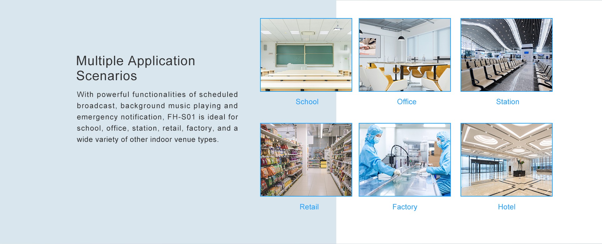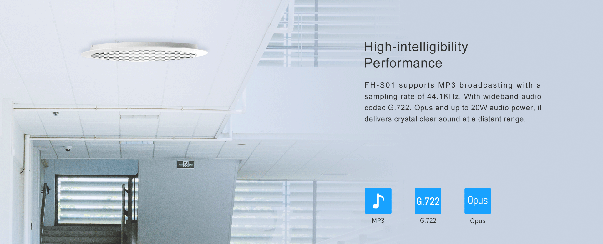FH-S01 is a SIP ceiling speaker featuring paging, multicasting, broadcasting and talkback functionalities. It supports up to 10 multicast zones with prioritization. It delivers high-intelligibility performance with G.722&Opus codecs. Adopted standard SIP 2.0(RFC3261) and related RFC protocols, it has strong compatibility and scalability.