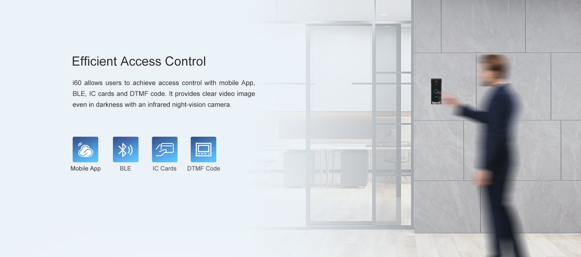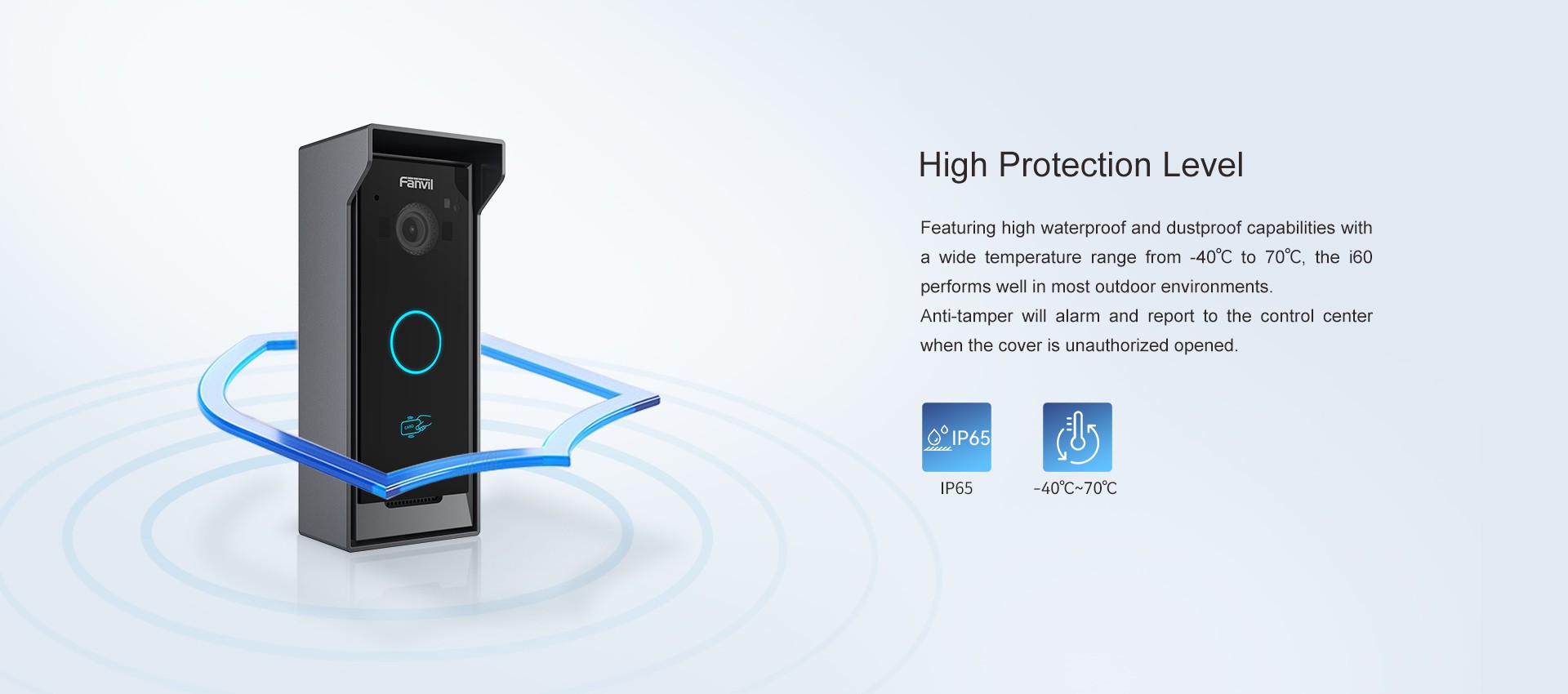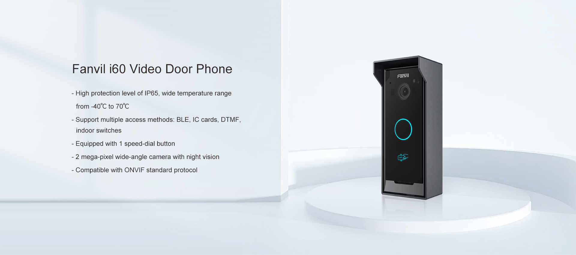 Fanvil i60 is a compact video door phone with a speed dial button and an IP65 rating for indoor and outdoor use. It supports various door-opening methods such as BLE, IC cards, remote DTMF and indoor switches for streamlined access management and is equipped with a 2 mega-pixel camera for audio and video communication. Compatible with SIP and ONVIF, it integrates with security systems and is ideal for villas, apartments, and communities.