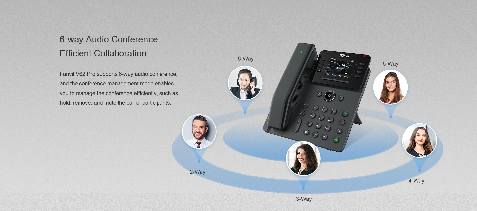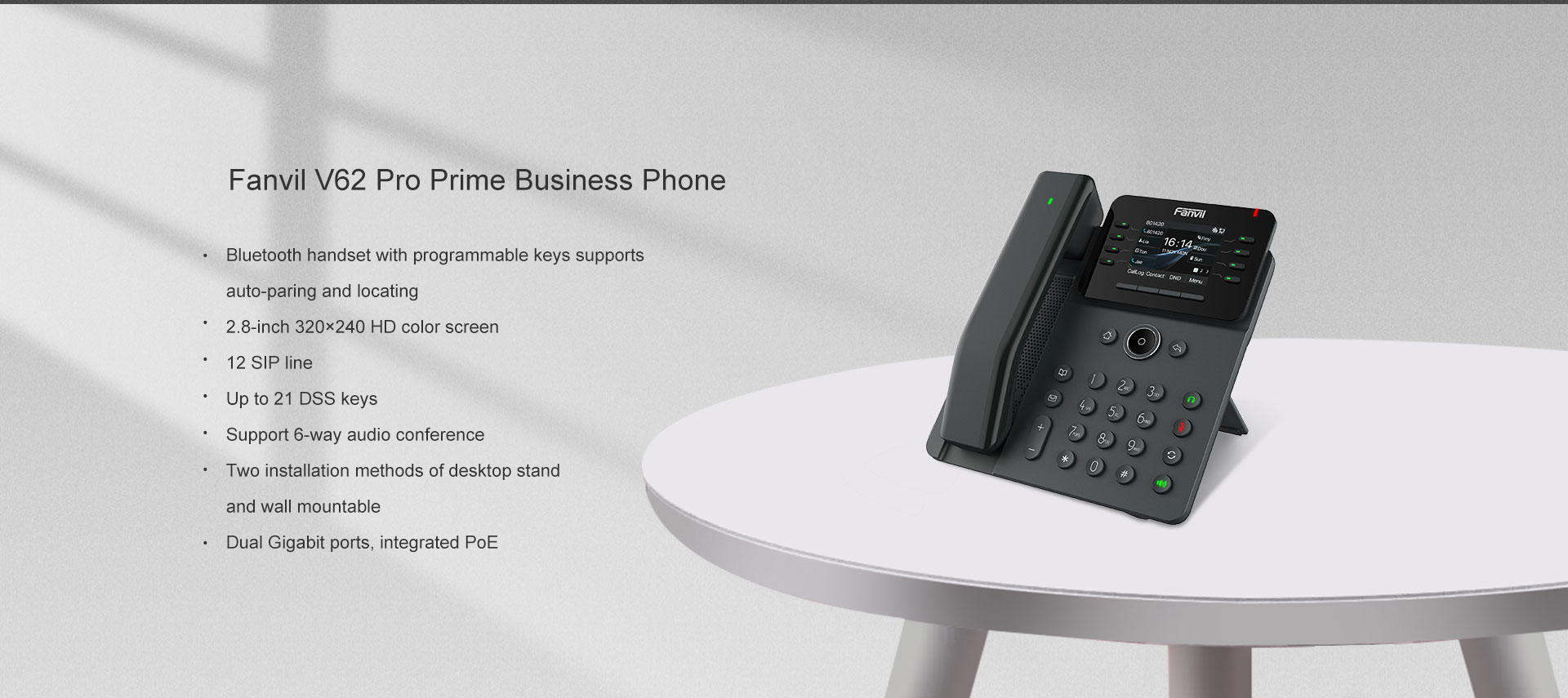 Fanvil V62 Pro is an essential business IP phone that features a HD color screen and an enriched Bluetooth handset with programmable keys for enhanced work productivity. The Bluetooth handsets are interchangeable across all V series Pro models and easy to locate if misplaced, ensuring superior convenience and functionality in office working. With 12 SIP lines, 6-way conferencing and dual Gigabit ports, V62 pro offers a high-performance communication experience tailored to modern business professionals.