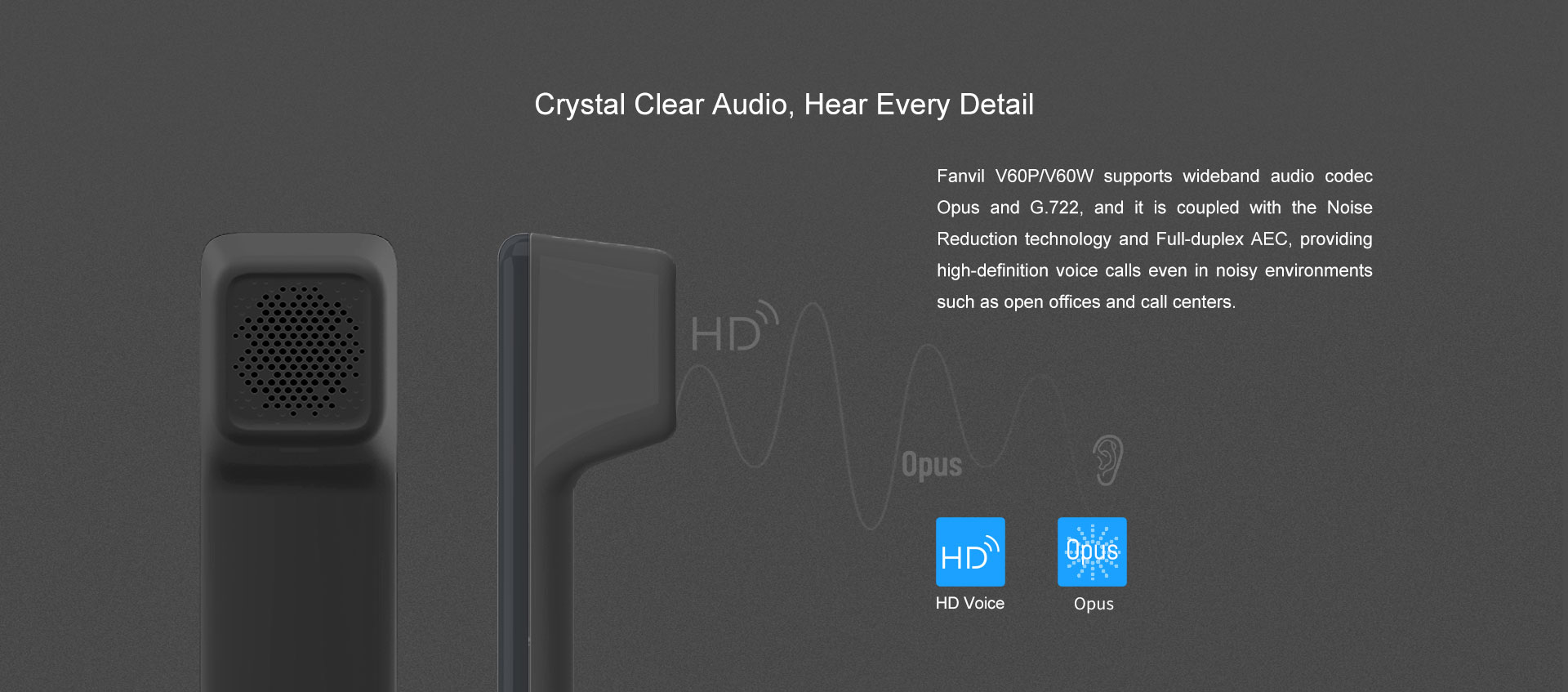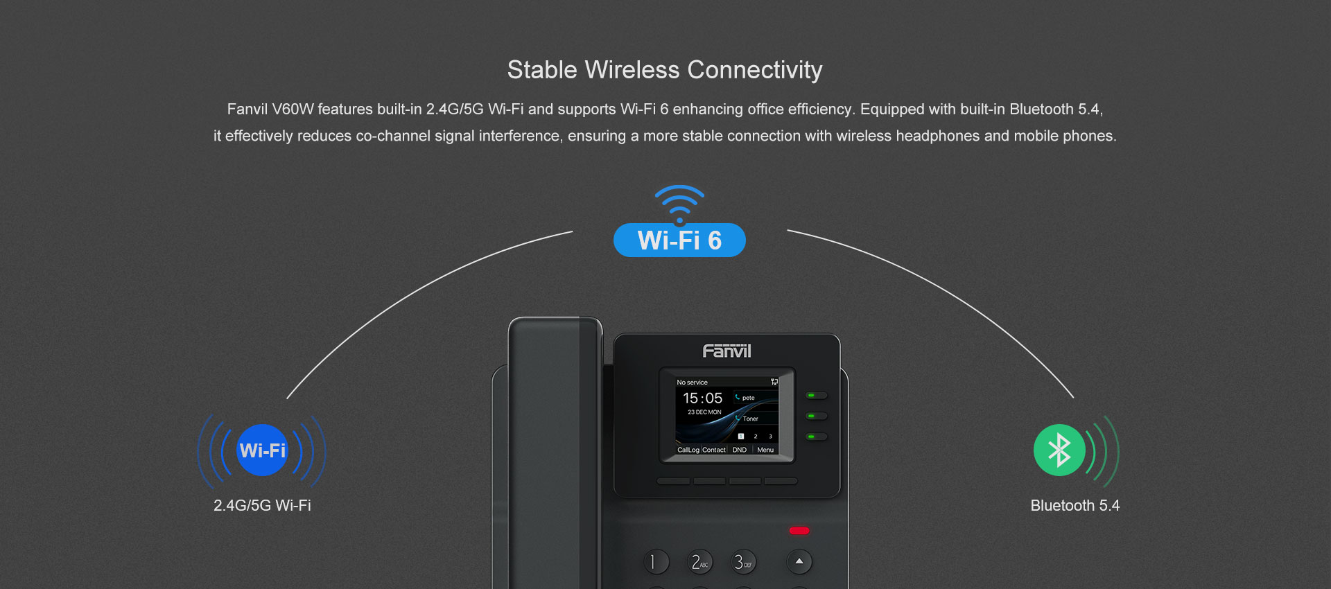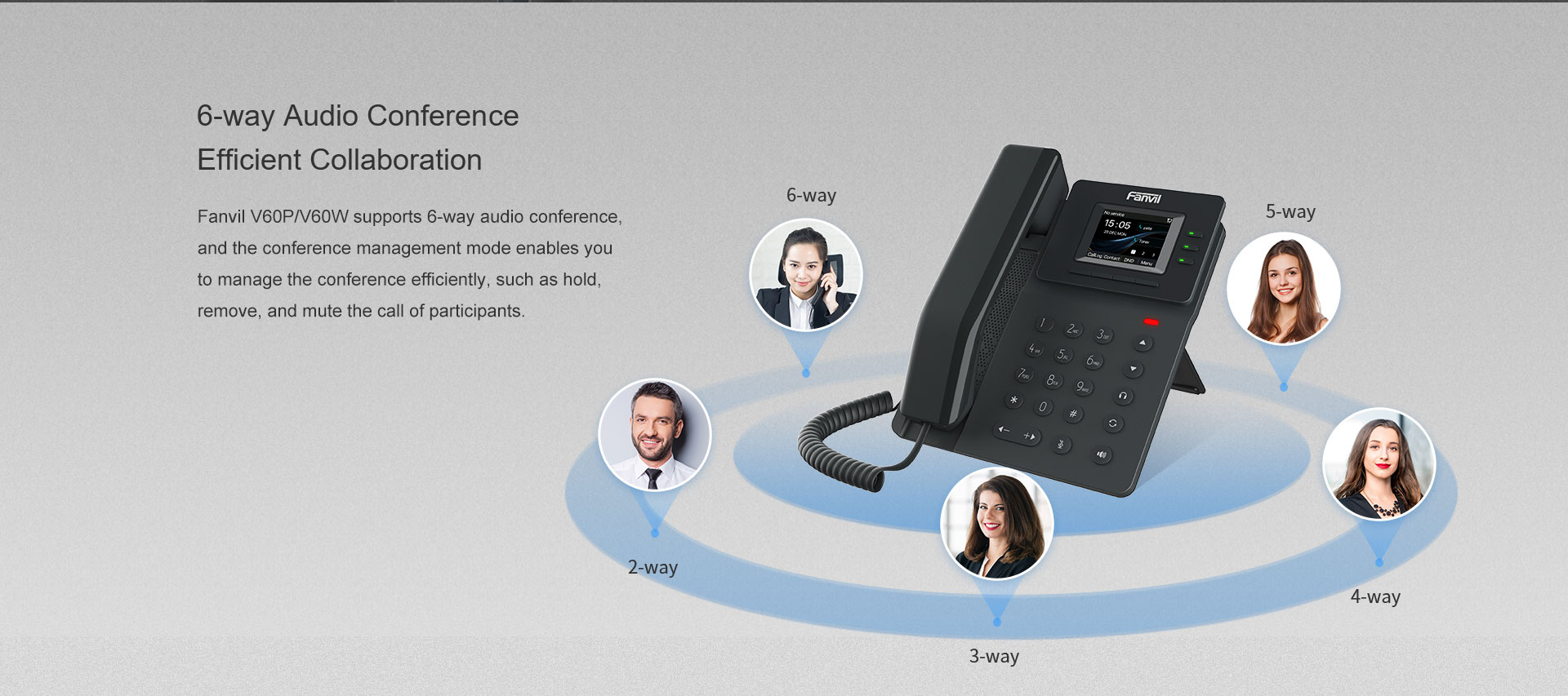 Fanvil V60P/V60W is a sleek and reliable basic-level IP phone. It features a 2.4-inch (320x240) color screen, supporting 4 SIP lines, HD voice, and 6-way audio conferencing, offering a clear and intuitive user experience to easily meet multi-party collaboration needs. Built-in 2.4G/5G Wi-Fi (Wi-Fi 6) and Bluetooth 5.4 (only V60W) enhance connectivity flexibility, providing users with an efficient and high-quality business communication experience.