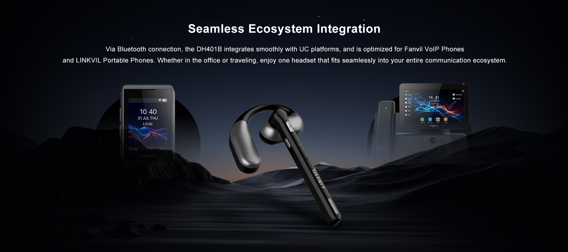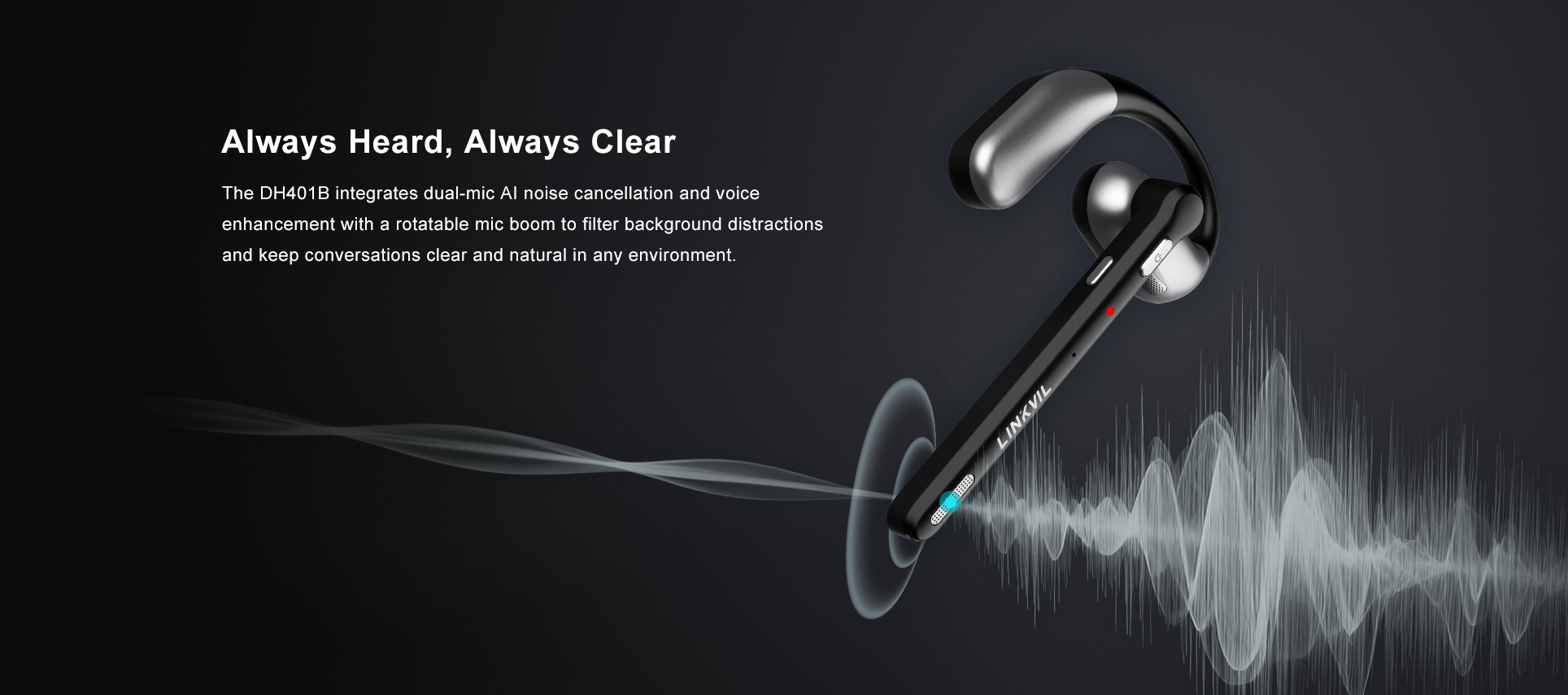 LINKVIL DH401B OWS Bluetooth Headset delivers clear and natural communication wherever you work — in transit, at the office, or on the go. Its open-ear design ensures hygiene and situational awareness for safer, more natural interaction. Equipped with dual-mic AI noise cancellation and precise voice pickup, it keeps every call crystal clear. The 13.6g lightweight ear-hook design provides a secure, comfortable fit, while Bluetooth 5.4 multipoint connection allows seamless switching between phone and PC. Compatible with LINKVIL portable phones and Fanvil VoIP phones, DH401B offers up to 23 hours of talk time with the charging case — enough to keep you productive throughout the day.