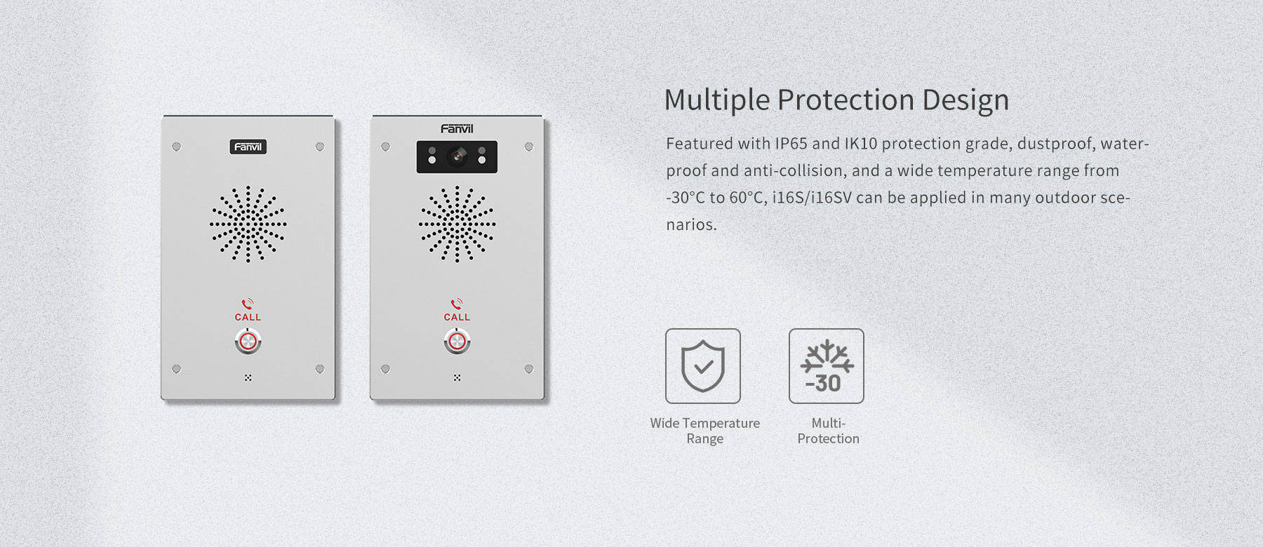 Fanvil i16S/i16SV is a SIP intercom with exquisite appearance, integrating audio/video intercom and broadcasting functionalities. It supports wall mounting. With a dustproof, waterproof and anti-collision design rated at IP65 and IK10 protection grade, it can be applied in many indoor and outdoor scenarios and offer the best communication experience for users.