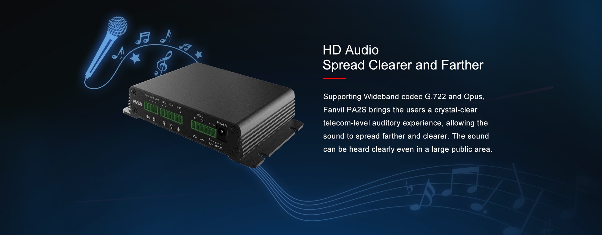 Fanvil PA2S is a SIP paging gateway that uses the standard IP/RTP/RTSP protocol for media streaming. It sets a variety of functional interfaces in one: broadcast, recording, intercom, security. Through the connection of the external devices to achieve audio and video intercom, broadcast, security trigger and other practical functions, Fanvil PA2S can apply to multiple scenarios to deploy the equipment. The size of the device is small, which is suitable for DIY applications of various integrated solutions.