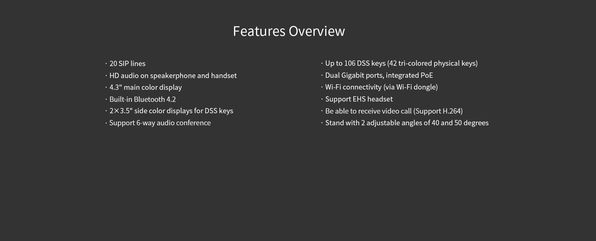 X210 is a high-end enterprise IP phone for users who need to get access to flexible and advanced features to handle medium to high call volumes in their daily work. Featuring 10 DSS keys on 4.3" main color display, up to 96 DSS keys (32 physical) on 2×3.5" side color displays, X210 has up to 106 DSS keys in total to set for BLF, speed dial, group broadcasting function etc. It also comes with HD audio, built-in Bluetooth, Wi-Fi connectivity, EHS support, dual Gigabit, PoE, IP camera/SIP door phone integration, delivering vast productivity with these advanced features.