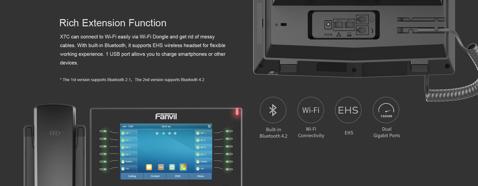With a modern, clear design, Fanvil X7C is a high-end enterprise IP phone for business users who need immediate access to all of their important information. In addition to a 5-inch high-resolution color screen, the telephone also features 20 SIP lines, HD audio with Opus support, up to 60 DSS keys (12 physical), Built-in Bluetooth, Wi-Fi connectivity and more!