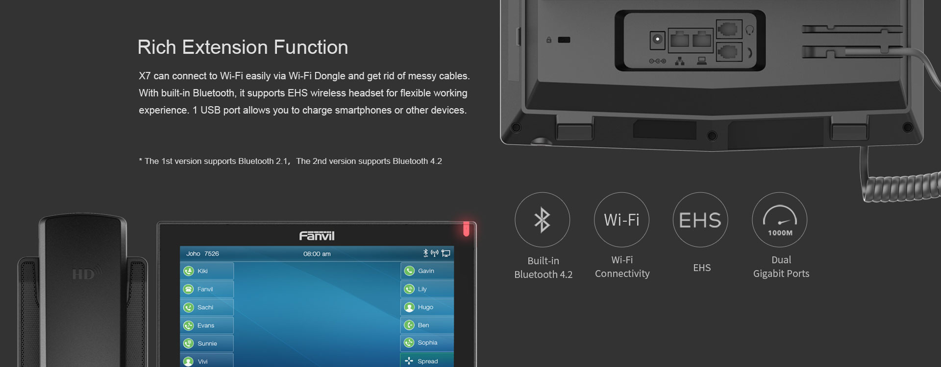 With a modern, clear design, Fanvil X7 is a high-end enterprise IP phone for business users who need immediate access to all of their important information. In addition to a 7-inch capacitive touch screen for up to 127 DSS key entries, the telephone also features 20 SIP lines, HD audio with Opus support, built-in Bluetooth, Wi-Fi connectivity, SIP hotspot, Gigabit Ethernet port, PoE, EHS headset support, etc., and can linkage with video door phones and IP cameras.