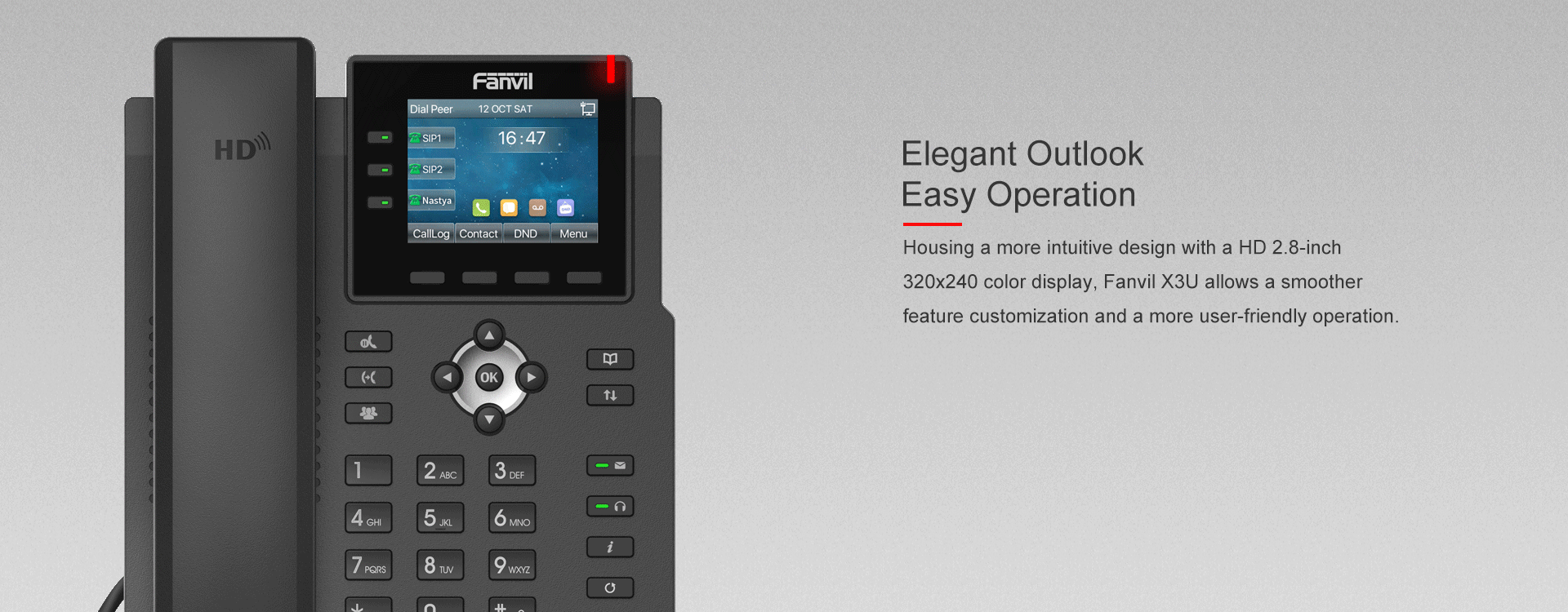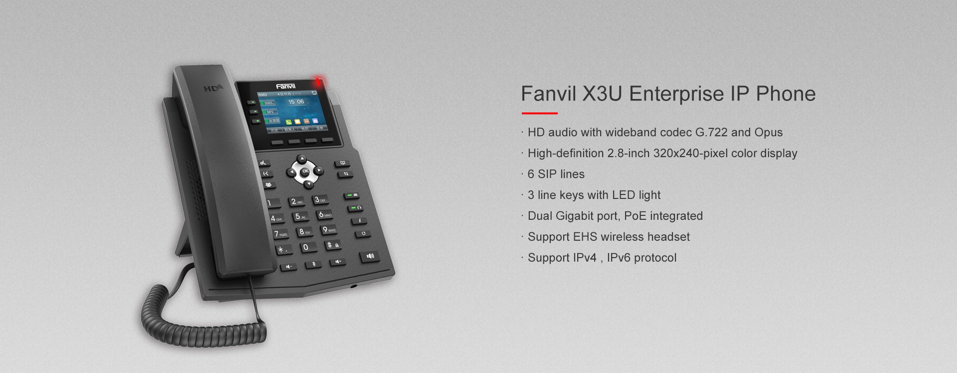 As an ideal cost-effective Gigabit IP phone, Fanvil X3U provides the direct access to instructions with the intuitive design of high-resolution color display and newly increased line keys, offering you greater flexibility, productivity, to exceed the different demands of businesses. Wideband codec of G.722 and Opus in this device deliver you an immersive HD audio experience in both high band and low band with the network.