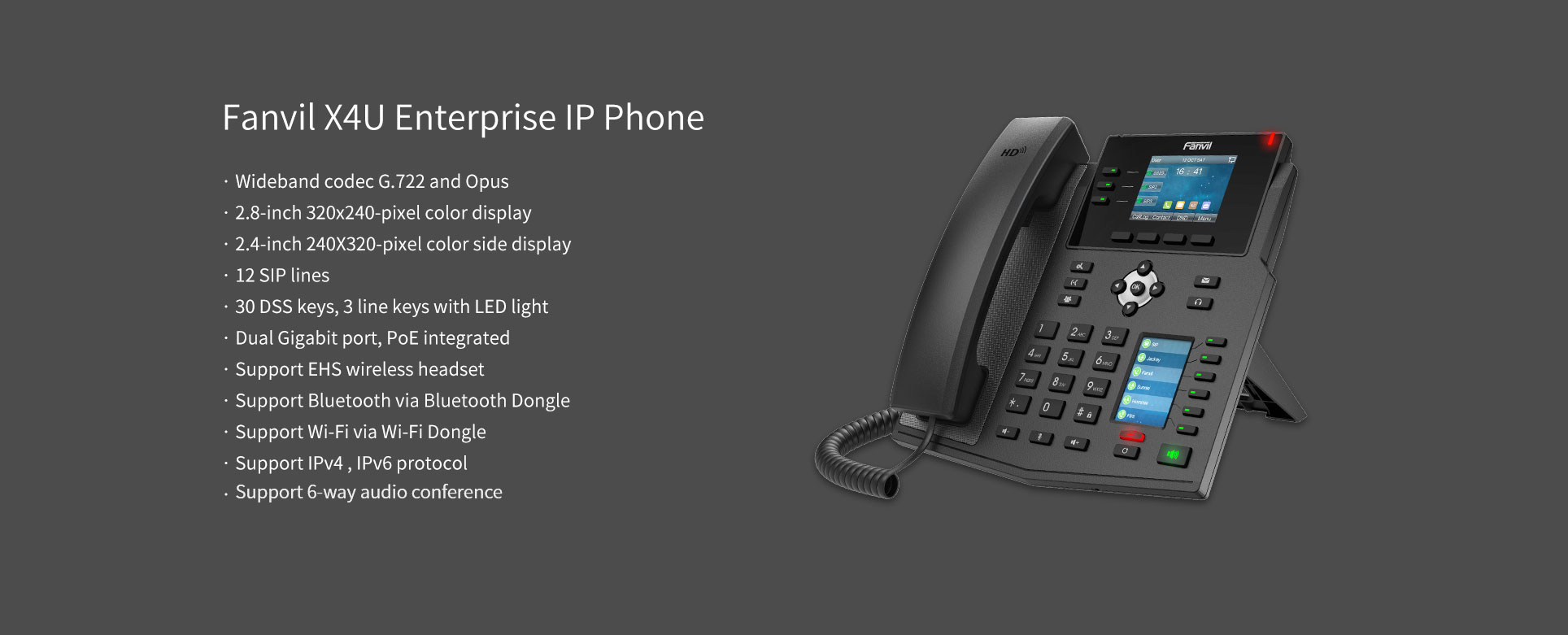 Fanvil X4U provides the direct access to instructions with two high-resolution 320x240 color displays, which is an ideal option for enterprises to improve the flexibility and have a greater productivity on daily work. Wideband codec of G.722 and Opus in this device delivers you an immersive HD audio experience in both high band and low band with the network.