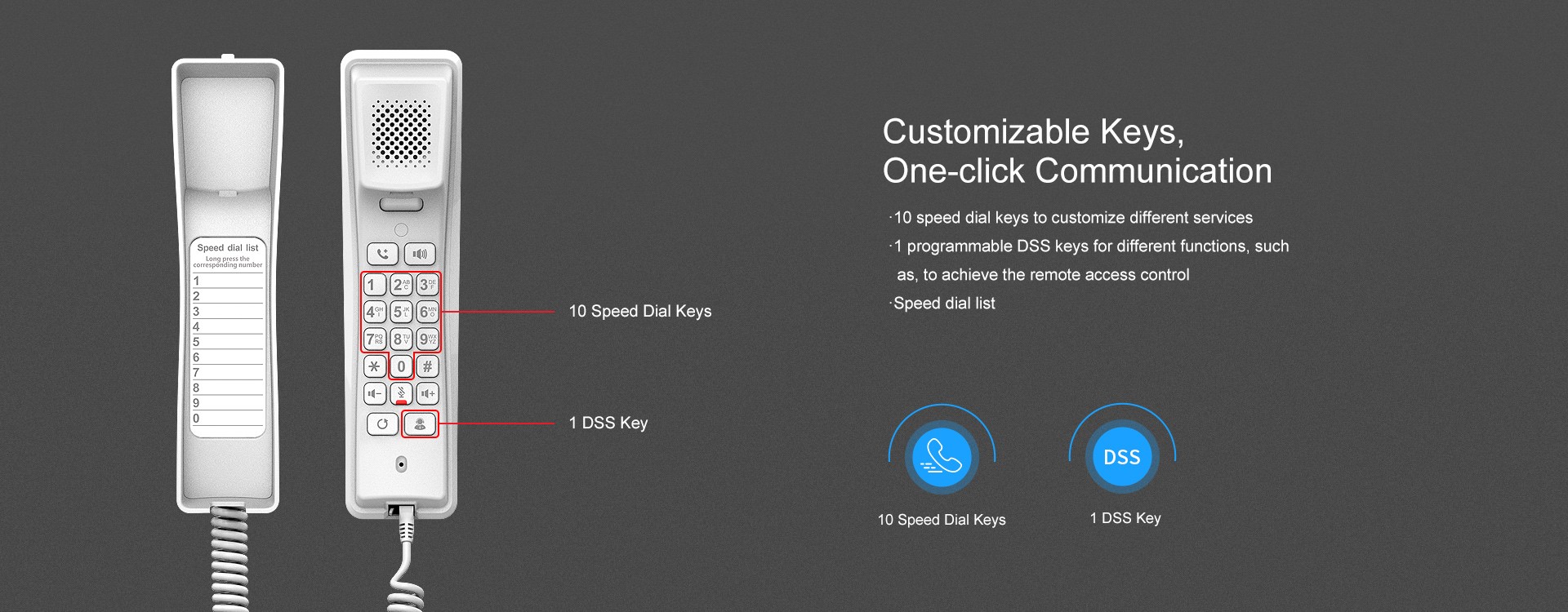Tiny and stylish, Fanvil H2U compact IP phone possesses brand new features including 2 SIP lines, 10 speed dial keys, 1 programmable DSS key and a HD speaker on handset. Supporting desktop and wall-mounted mode, PoE and power supply charging mode, Fanvil H2U is more than a hotel phone and also can be applied in multiple scenarios, such as school, hospital, supermarket and residence.