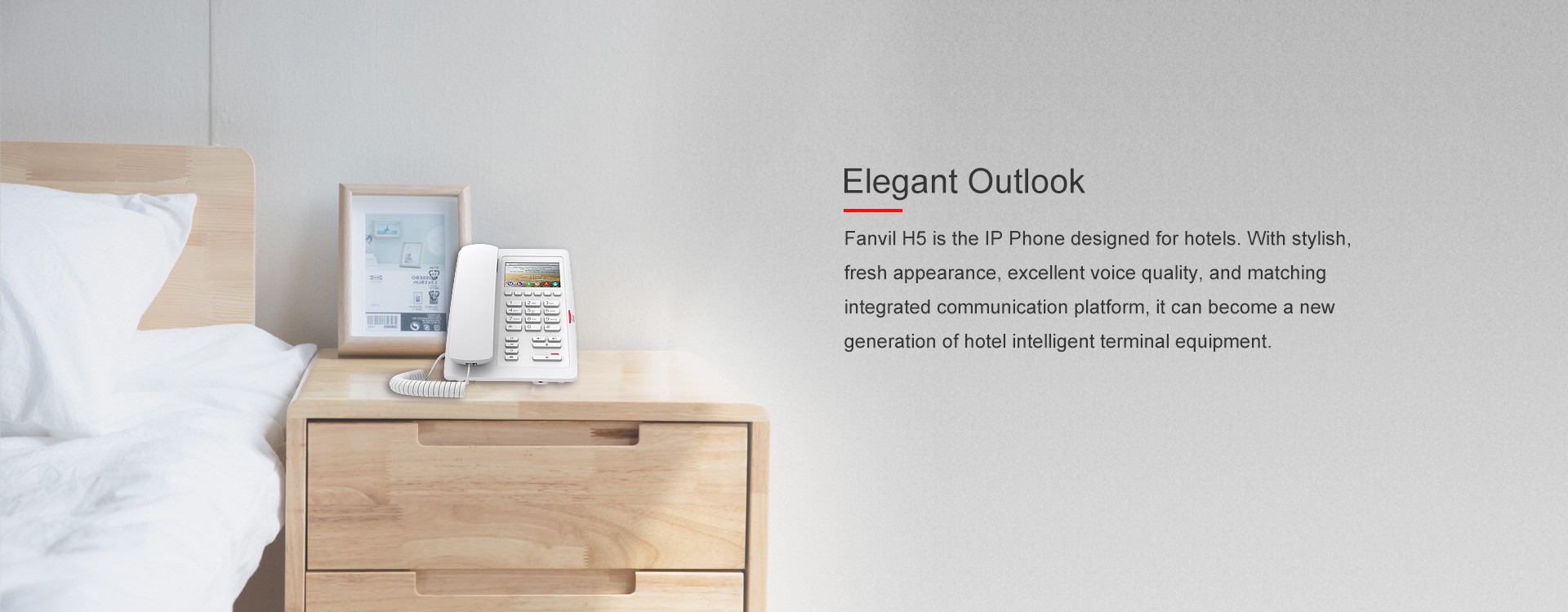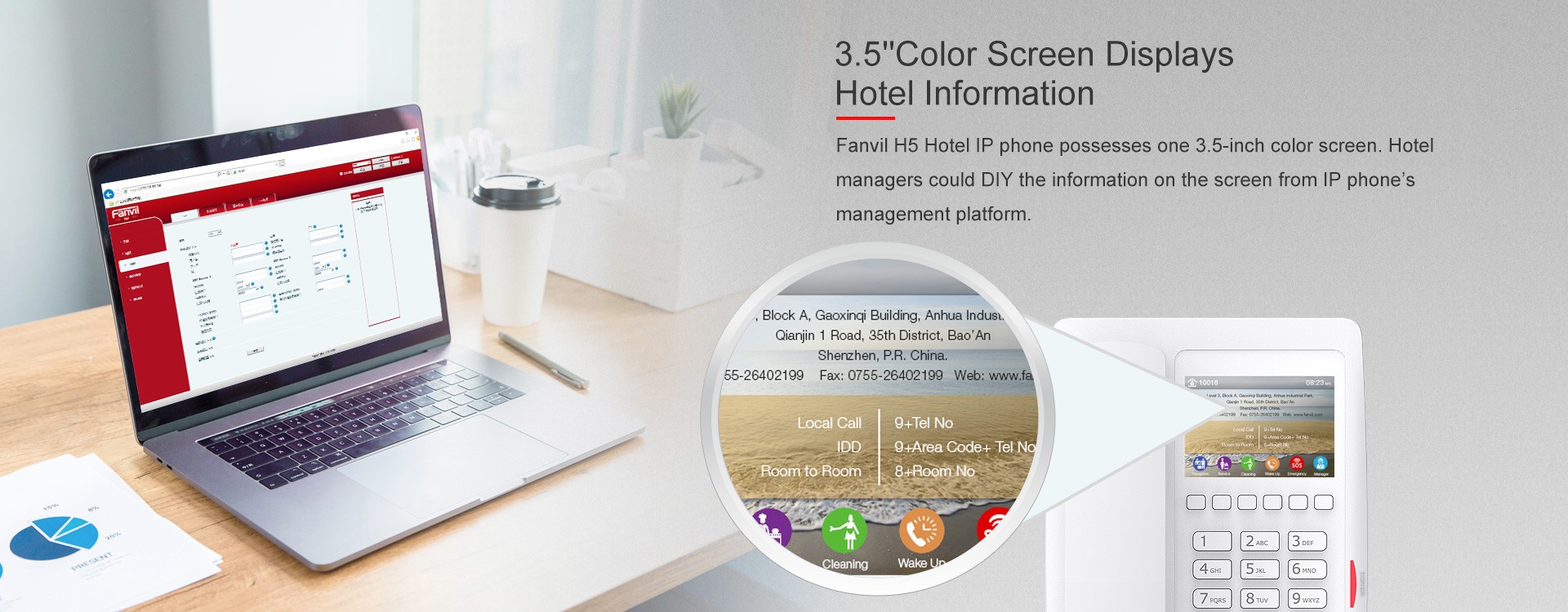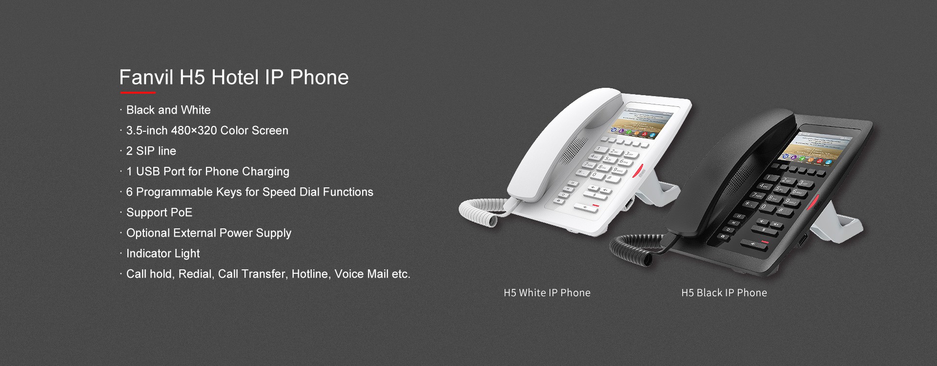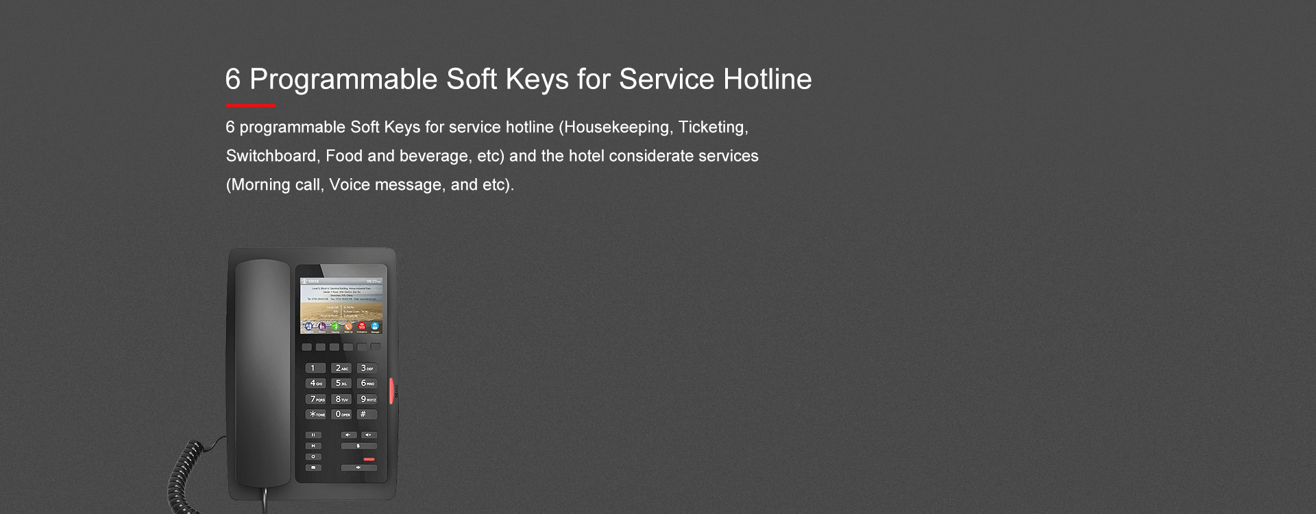 With two available colors (White & Black), Fanvil H5 is a great and affordable choice for hotel IP phone. Possessing a 3.5-inch color screen, it is also an user-friendly hotel IP phone. Hotel could customize the information (such as hotel's address, logo, related phone numbers and etc) on the screen, and bring a better living experience to the hotel guests.