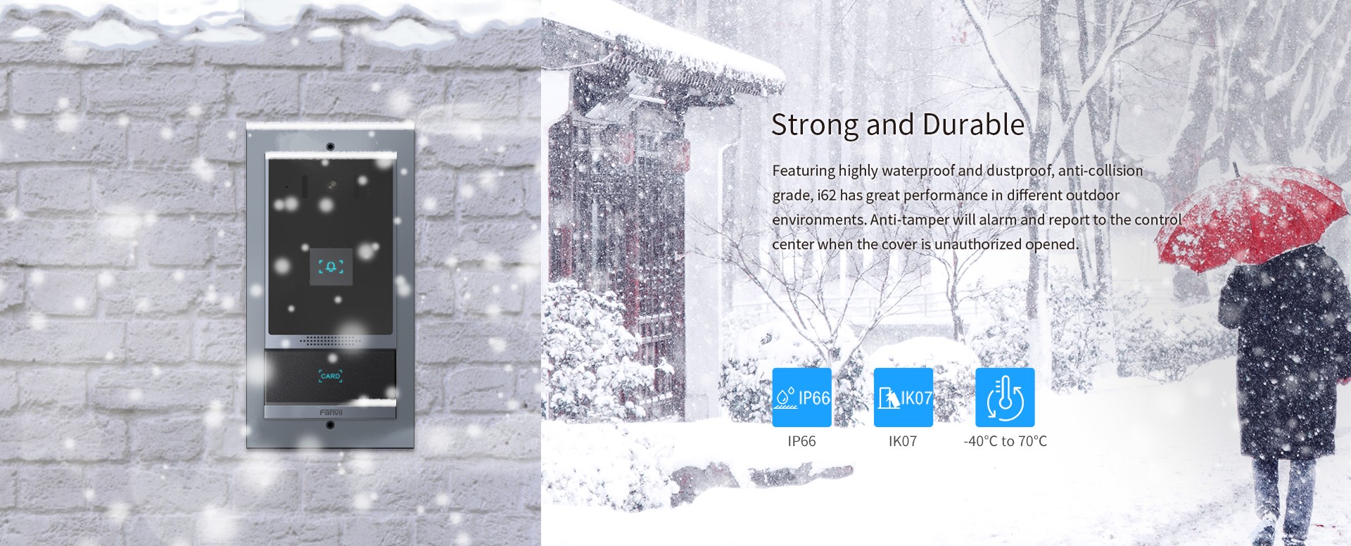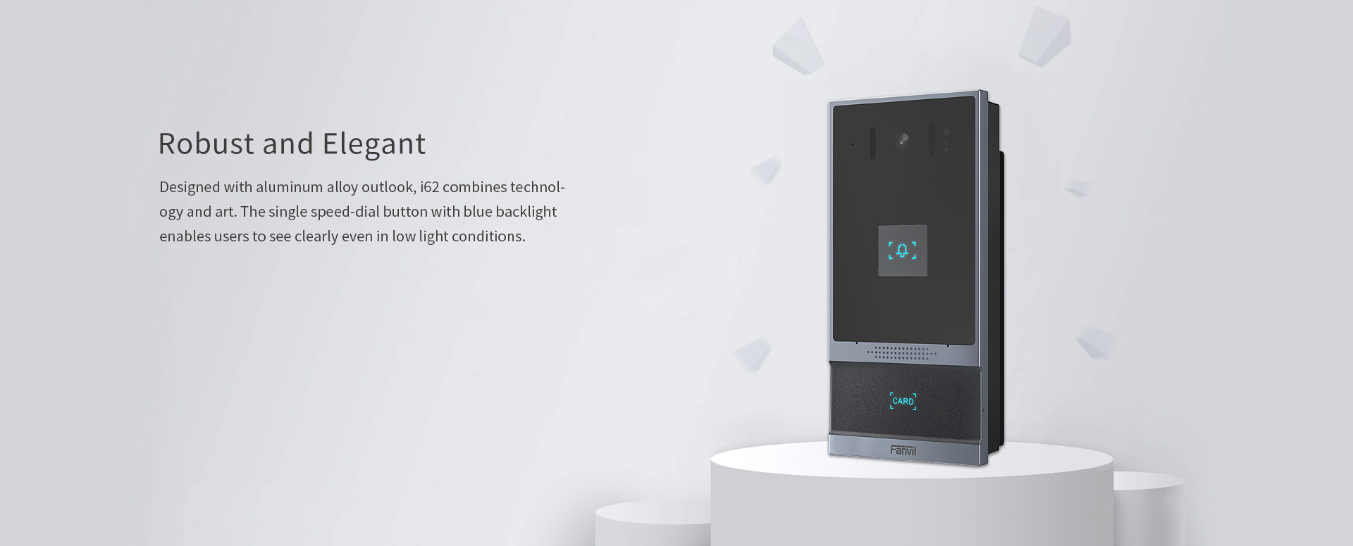 Based on SIP and ONVIF protocols, i62 is a video door phone that integrates powerful functionalities of access control, intercom, and security protection. Featuring an aluminum alloy design and single speed-dial button, i62 delivers a high-quality elegant appearance. With high protection level IP66 and IK07, it is waterproof, dustproof and anti-collision in most outdoor environments. i62 allows users to make audio/video calls via a speed-dial button and a 2 Mega-pixel camera and achieve access control by different modes. With rich input and output interfaces, i62 is easy to link with other security devices and customize into various solutions in apartments, commercial buildings, communities and industrial parks.