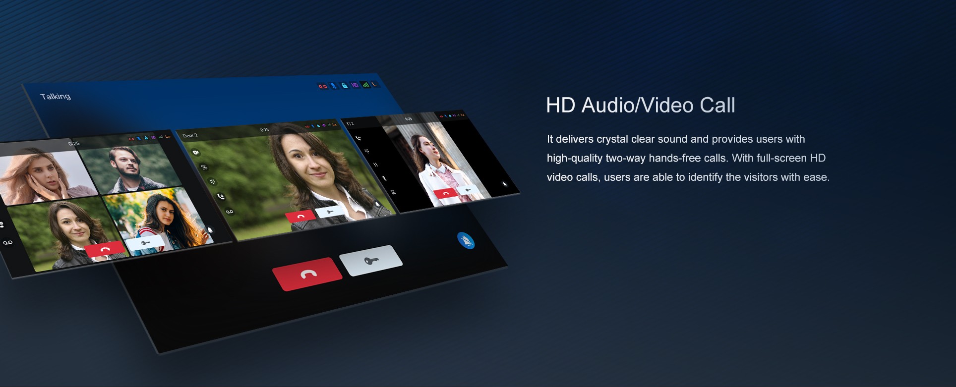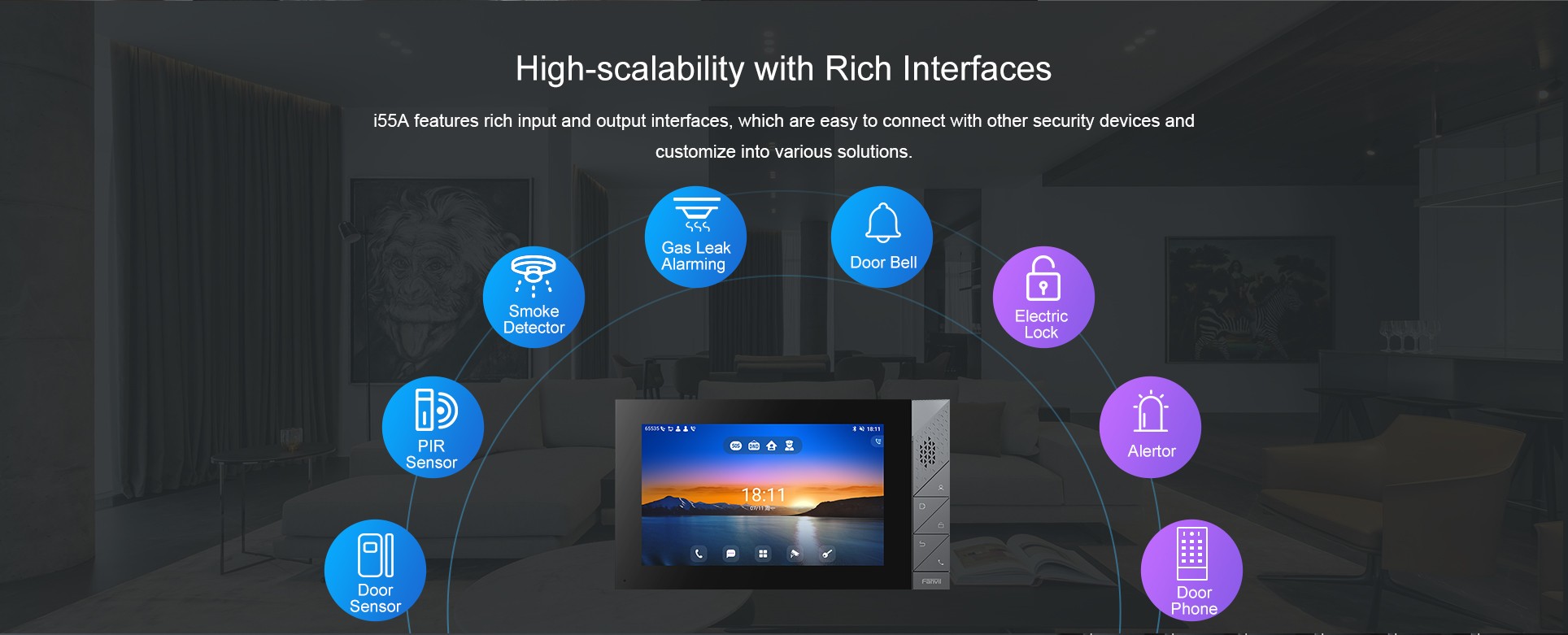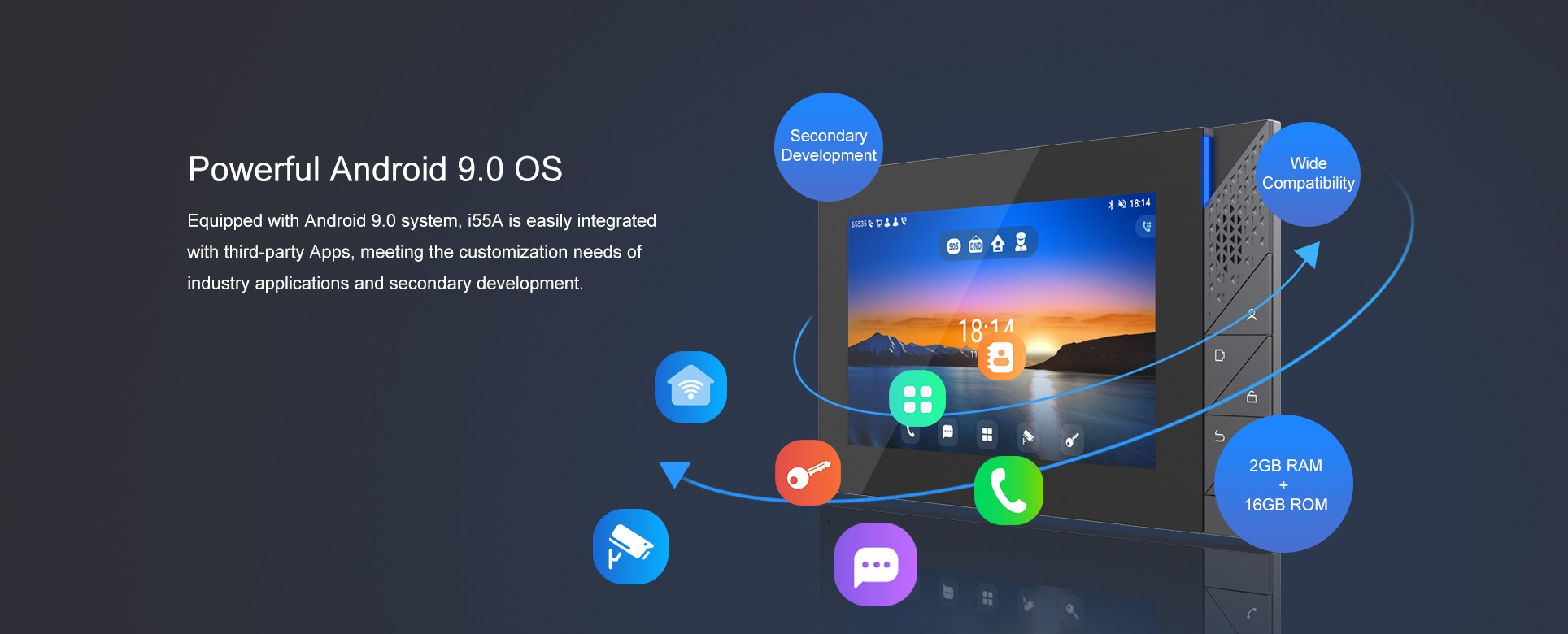 Fanvil i55A indoor station features 7-inch color touch screen with an intuitive UI. Based on Android 9.0 operating system, it meets industry application customization needs and secondary development. Featuring powerful functionalities like remote door opening and real-time monitoring for security devices, i55A serves as a management assistant for communities, villas and office buildings.