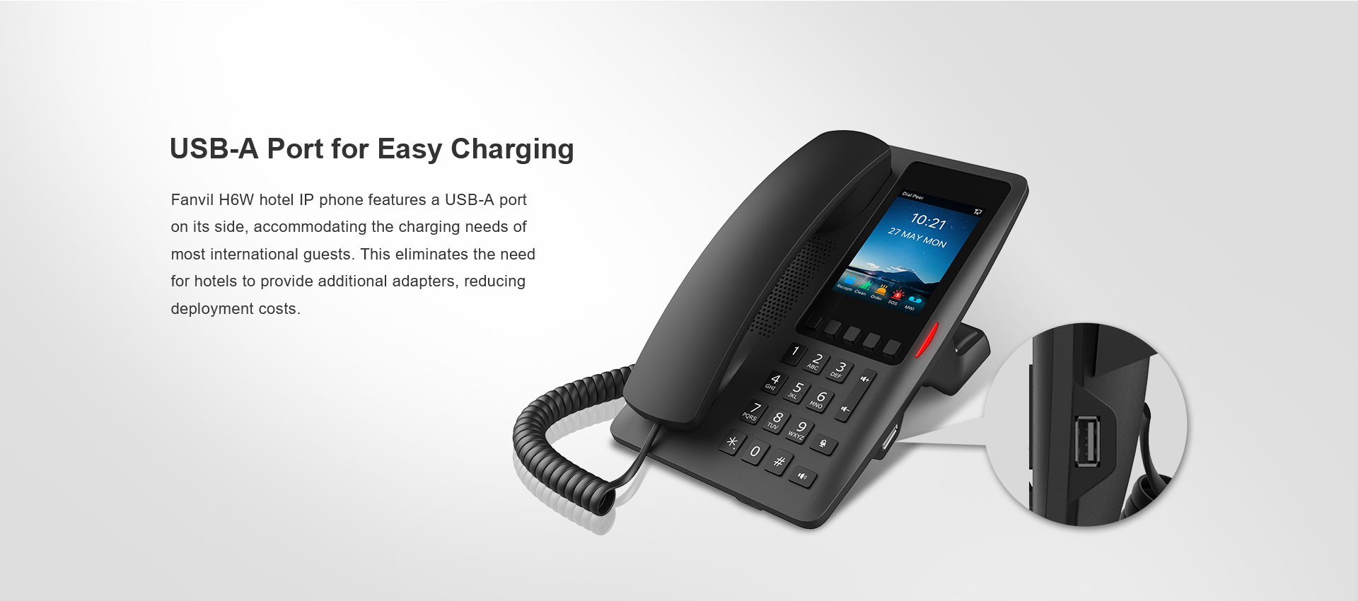 Fanvil H6W is a cost-effective Wi-Fi IP phone with multiple functions and an elegant appearance. It is equipped with 5 programmable soft keys for the services hotline, catering to diverse hotel scenarios. H6W has built-in dual-band 2.4GHz & 5GHz Wi-Fi (Wi-Fi 6), ensuring seamless connectivity. Additionally, it features HD voice, 10/100Mbps Ethernet, and PoE, enhancing the overall user experience while reducing hotel deployment costs. Beyond hotel settings, the H6W is also suitable for use in shopping malls, hospitals, supermarkets, and other environments.