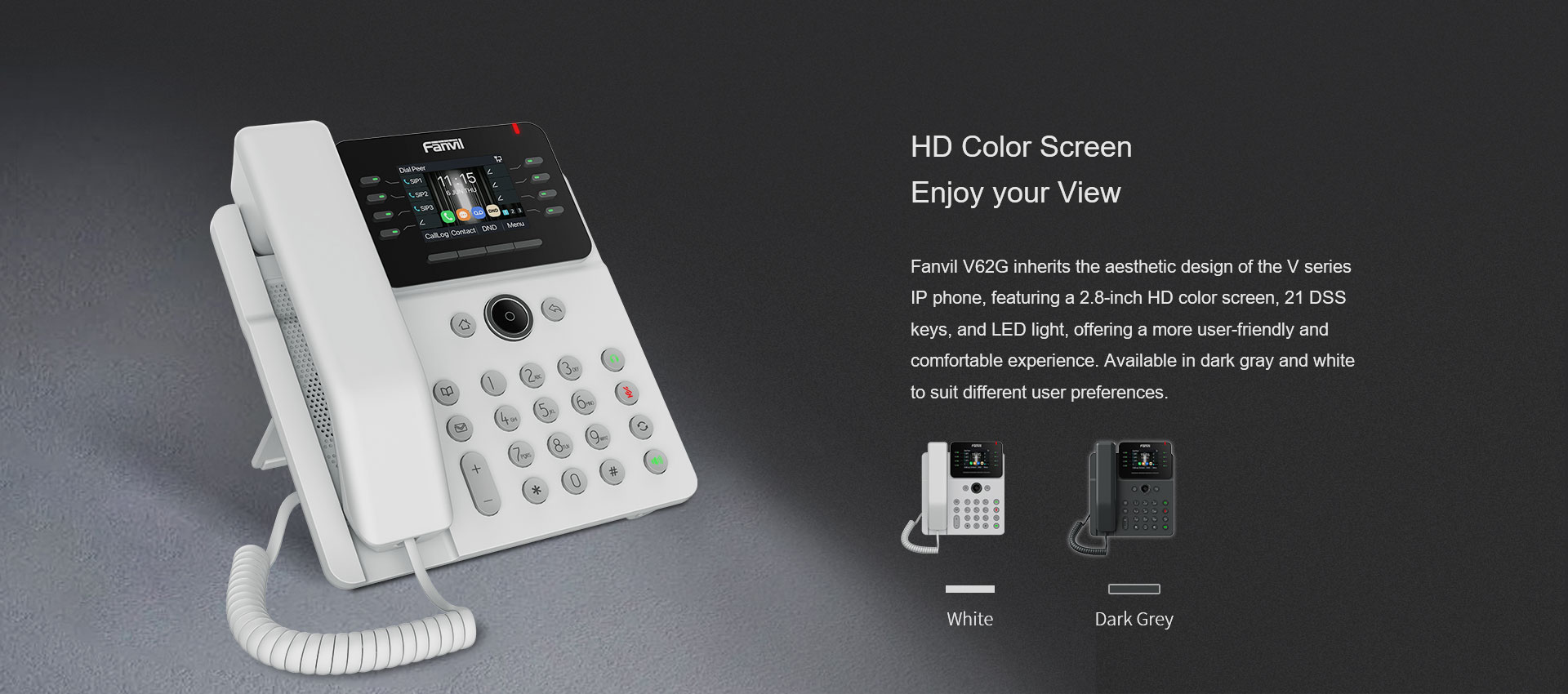 Fanvil V62G is a stylish and user-friendly business IP phone. It features a 2.8-inch (320x240) high-definition color screen, supports 12 SIP lines, and allows for a 6-way audio conference. With rich functions such as HD audio, dual Gigabit ports, the V62G is suitable for various business application scenarios, providing users with an excellent interactive experience and comfortable instant communication services.