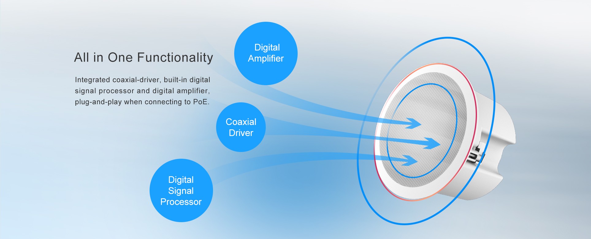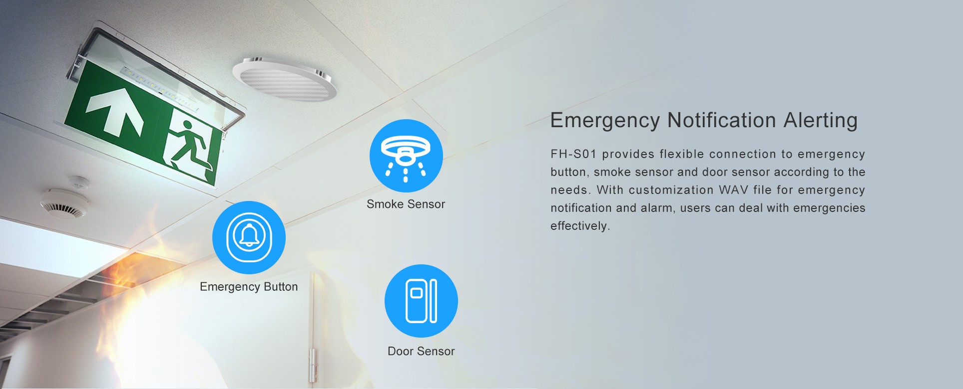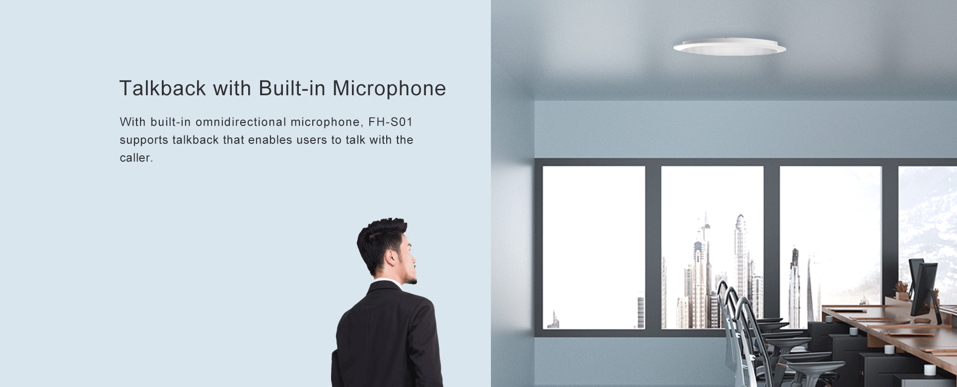 FH-S01 is a SIP ceiling speaker featuring paging, multicasting, broadcasting and talkback functionalities. It supports up to 10 multicast zones with prioritization. It delivers high-intelligibility performance with G.722&Opus codecs. Adopted standard SIP 2.0(RFC3261) and related RFC protocols, it has strong compatibility and scalability.