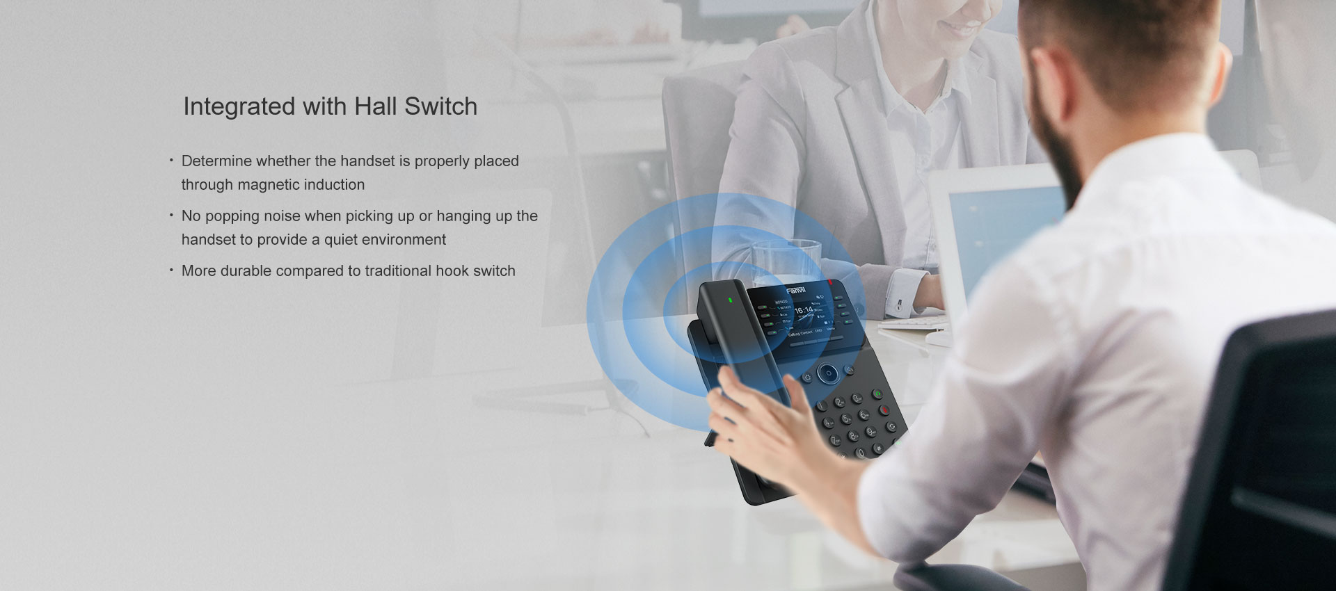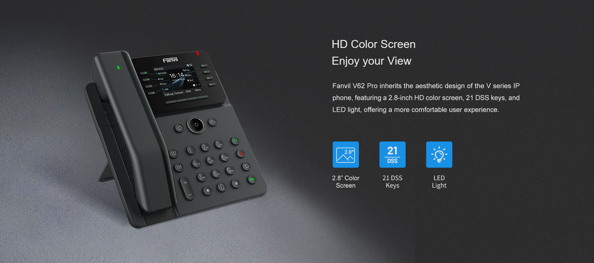Fanvil V62 Pro is an essential business IP phone that features a HD color screen and an enriched Bluetooth handset with programmable keys for enhanced work productivity. The Bluetooth handsets are interchangeable across all V series Pro models and easy to locate if misplaced, ensuring superior convenience and functionality in office working. With 12 SIP lines, 6-way conferencing and dual Gigabit ports, V62 pro offers a high-performance communication experience tailored to modern business professionals.