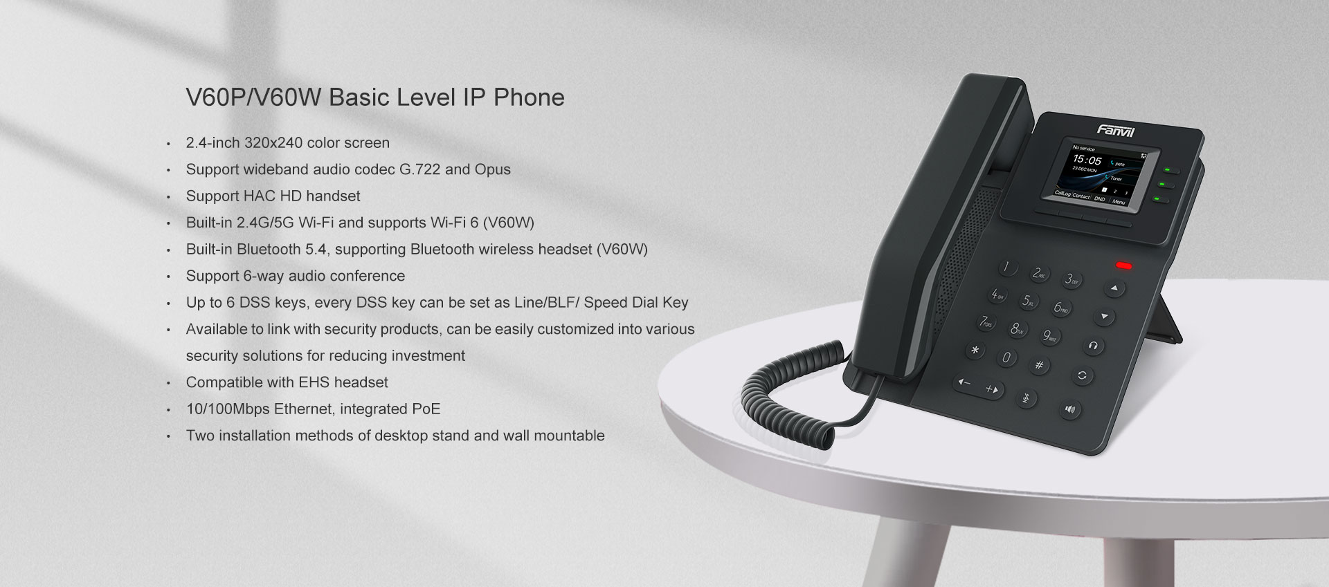 Fanvil V60P/V60W is a sleek and reliable basic-level IP phone. It features a 2.4-inch (320x240) color screen, supporting 4 SIP lines, HD voice, and 6-way audio conferencing, offering a clear and intuitive user experience to easily meet multi-party collaboration needs. Built-in 2.4G/5G Wi-Fi (Wi-Fi 6) and Bluetooth 5.4 (only V60W) enhance connectivity flexibility, providing users with an efficient and high-quality business communication experience.
