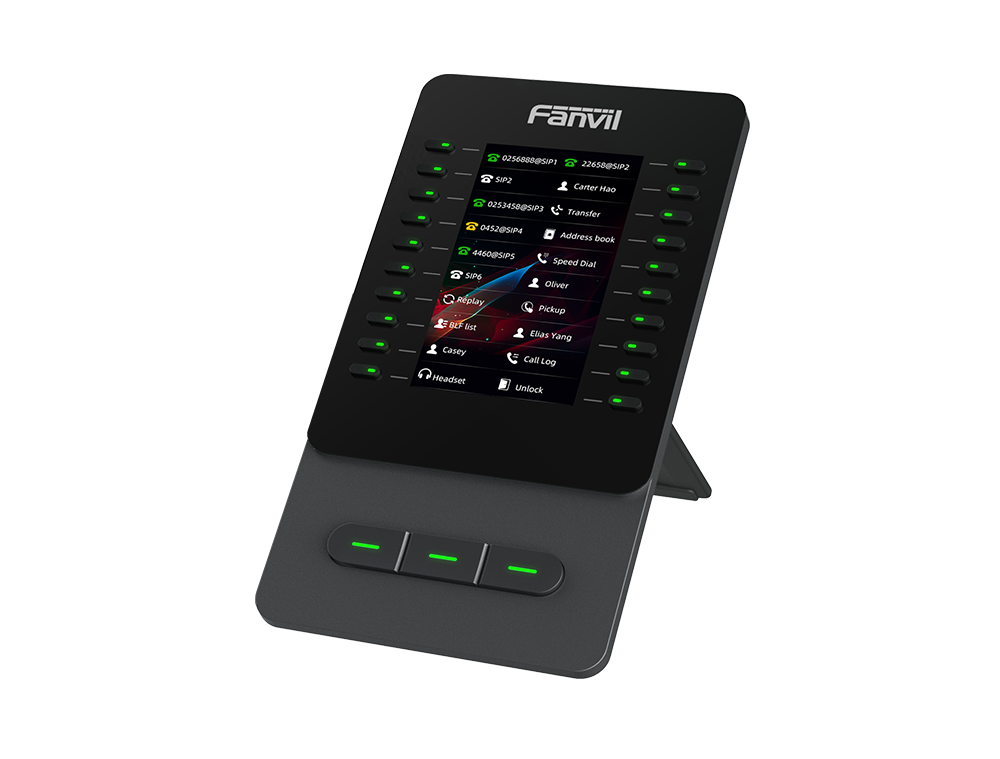 Fanvil EM60 is a multifunctional color-screen expansion module that can be used as an accessory with the V65/V66/V66 Pro phones, helping busy users handle high-volume calls with ease. It features a 4.3-inch color display and supports 60 programmable keys, each equipped with a dual-color LED indicator. When connected to a compatible phone, it enables features such as speed dial, call transfer, call hold, and BLF status display, assisting in efficiently managing large call volumes and improving office productivity.