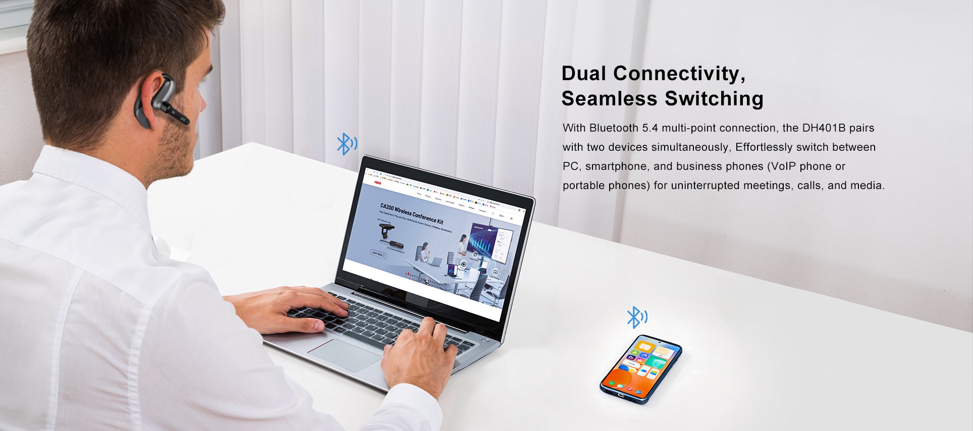 LINKVIL DH401B OWS Bluetooth Headset delivers clear and natural communication wherever you work — in transit, at the office, or on the go. Its open-ear design ensures hygiene and situational awareness for safer, more natural interaction. Equipped with dual-mic AI noise cancellation and precise voice pickup, it keeps every call crystal clear. The 13.6g lightweight ear-hook design provides a secure, comfortable fit, while Bluetooth 5.4 multipoint connection allows seamless switching between phone and PC. Compatible with LINKVIL portable phones and Fanvil VoIP phones, DH401B offers up to 23 hours of talk time with the charging case — enough to keep you productive throughout the day.